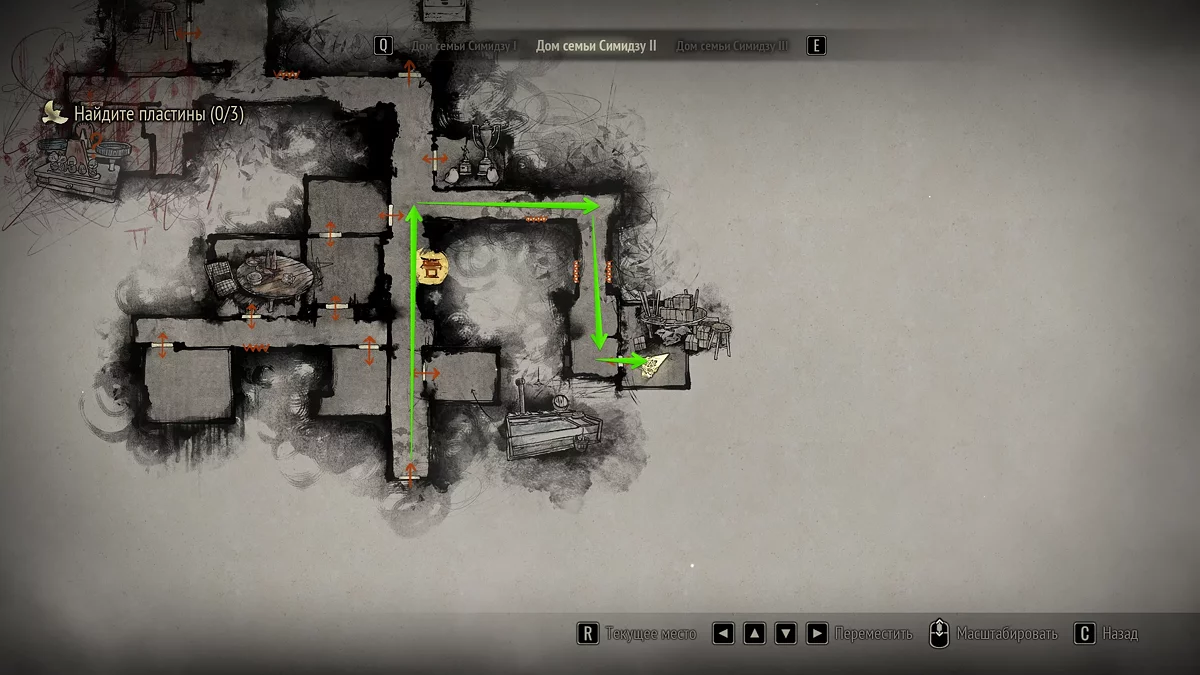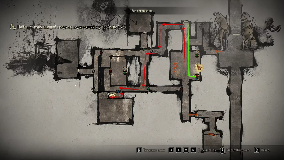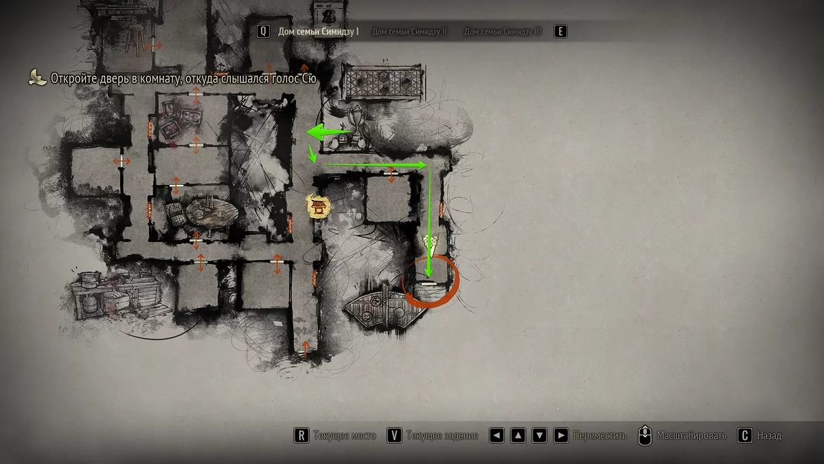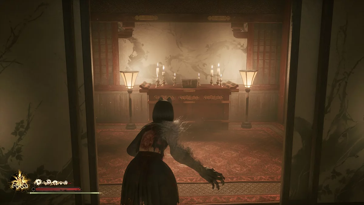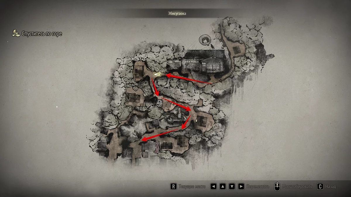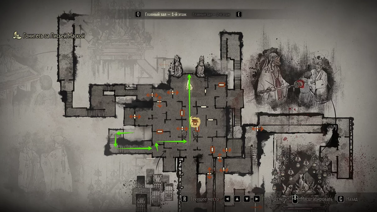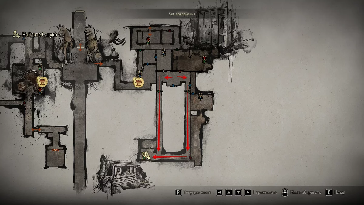 Увійдіть у двері зліва від розпису. Тепер відкрийте ширму у статуї лисиці зліва і витягніть уламок стріли. Пройдіть до кінця коридору і дістаньте з коробки герб з чорним горобцем. Тепер вийдіть з кімнати з вівтарем і перейдіть у приміщення справа. Приберіть стіну в режимі концентрації і пройдіть через ворота справа в зал з фрескою.