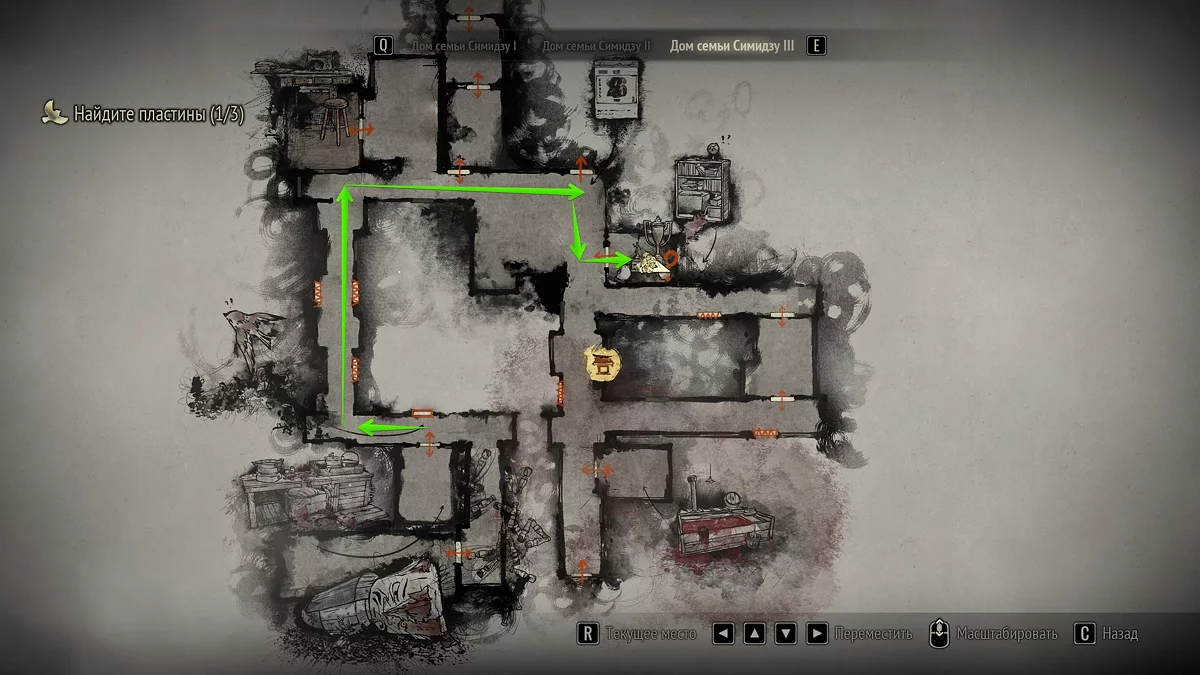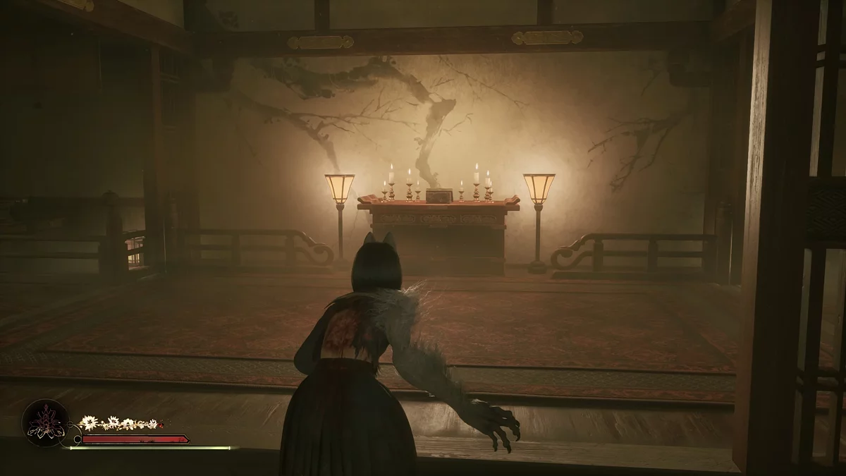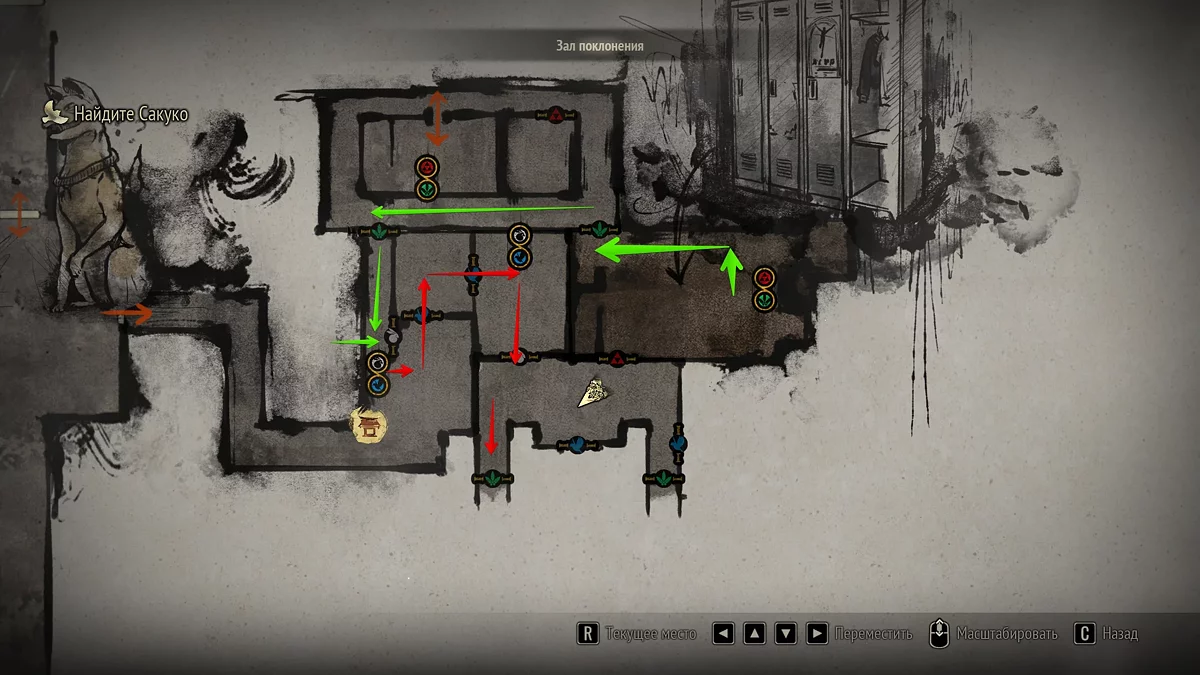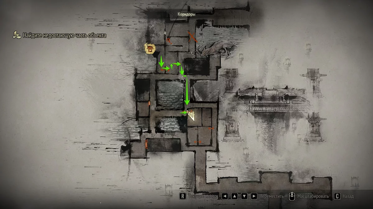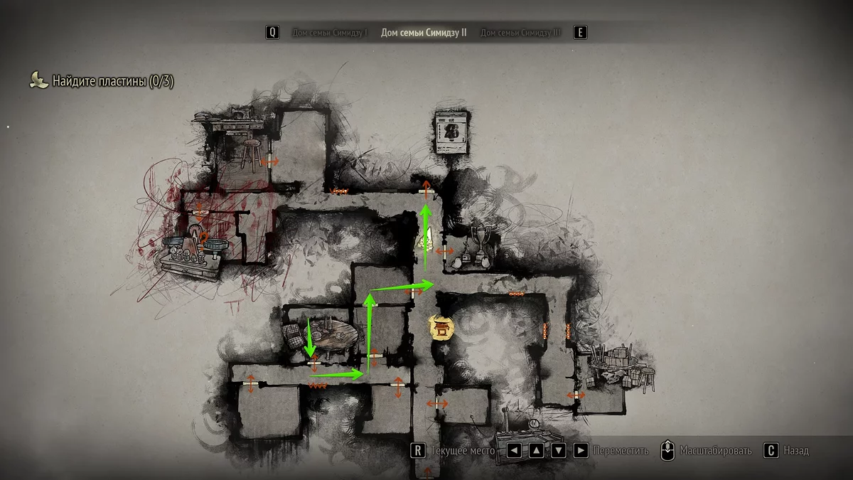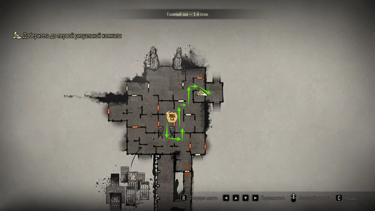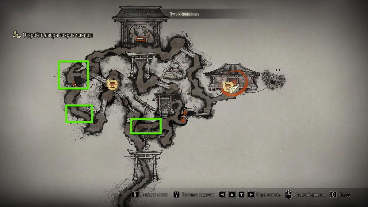 Увійдіть у двері зліва від розпису. Тепер відкрийте ширму у статуї лисиці зліва і витягніть уламок стріли. Пройдіть до кінця коридору і дістаньте з коробки герб з чорним горобцем. Тепер вийдіть з кімнати з вівтарем і перейдіть у приміщення справа. Приберіть стіну в режимі концентрації і пройдіть через ворота справа в зал з фрескою.