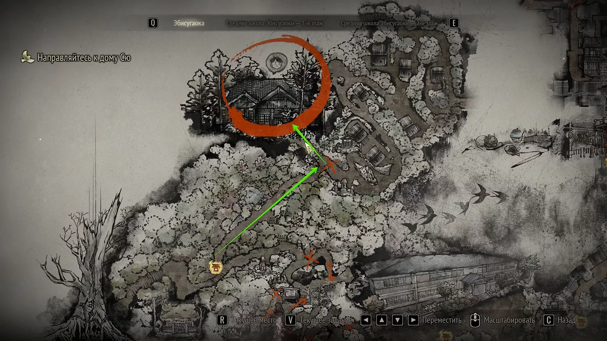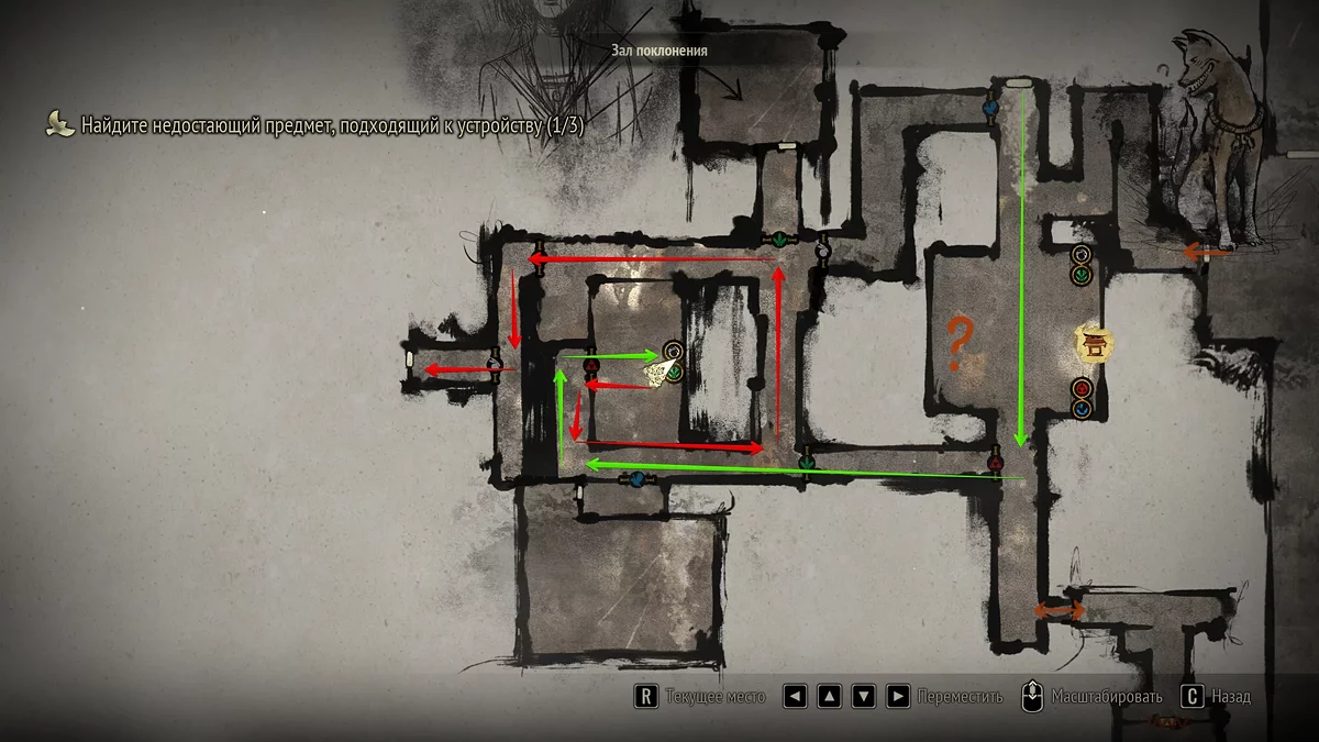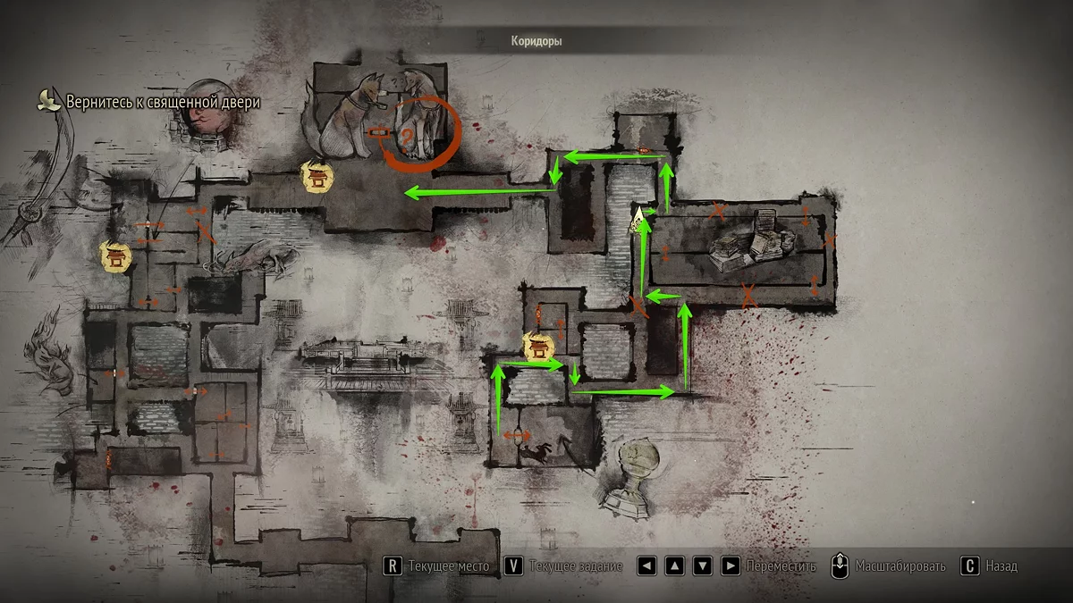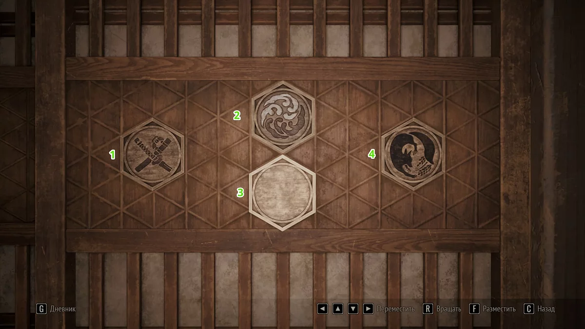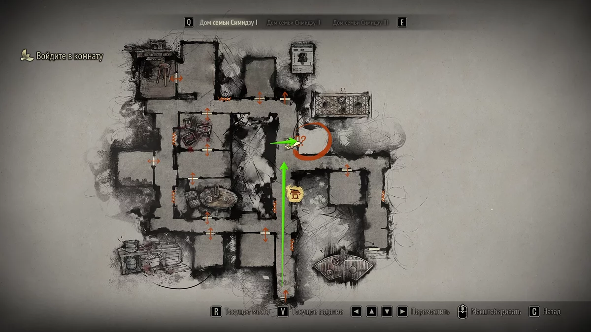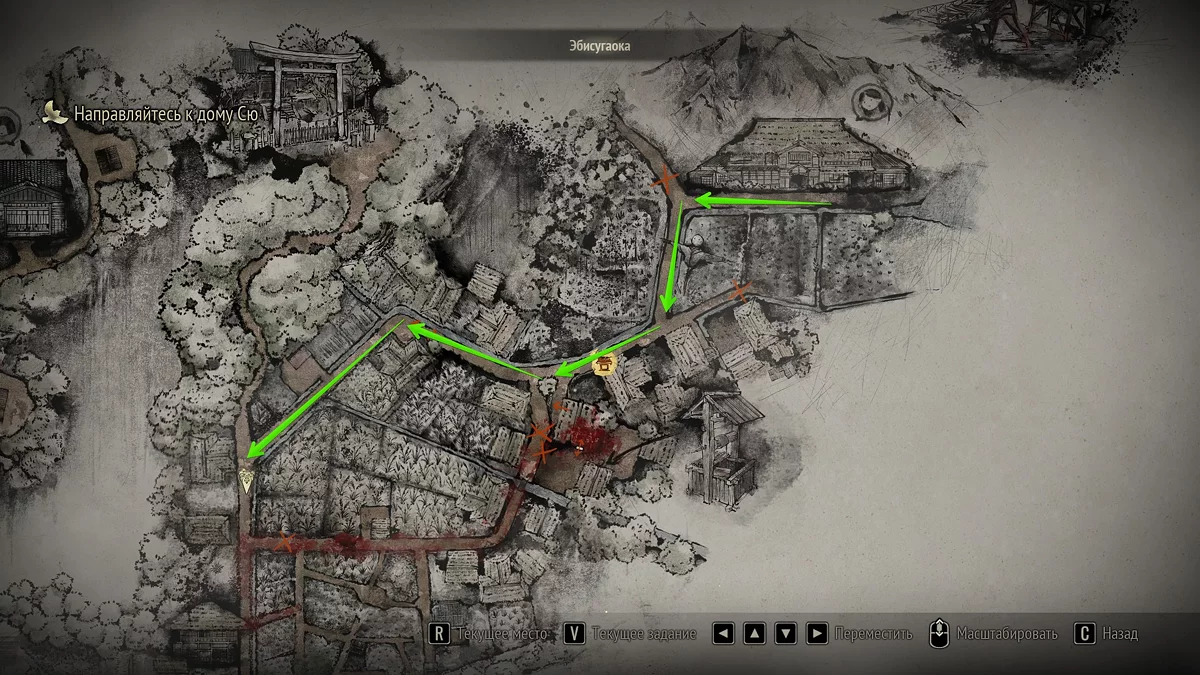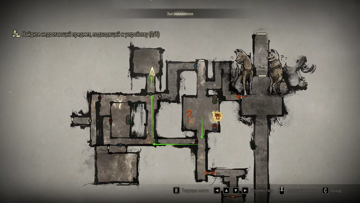 Увійдіть у двері зліва від розпису. Тепер відкрийте ширму у статуї лисиці зліва і витягніть уламок стріли. Пройдіть до кінця коридору і дістаньте з коробки герб з чорним горобцем. Тепер вийдіть з кімнати з вівтарем і перейдіть у приміщення справа. Приберіть стіну в режимі концентрації і пройдіть через ворота справа в зал з фрескою.