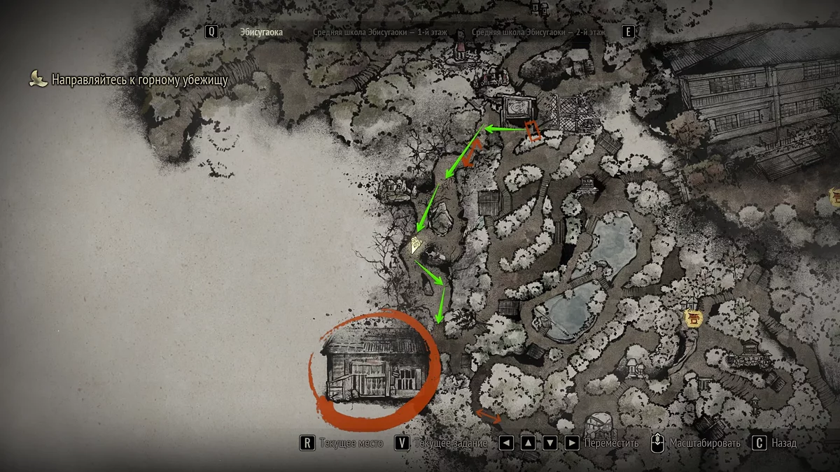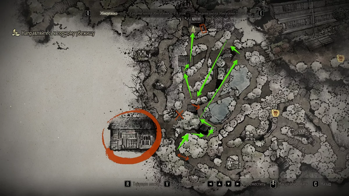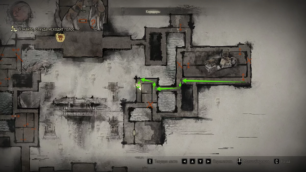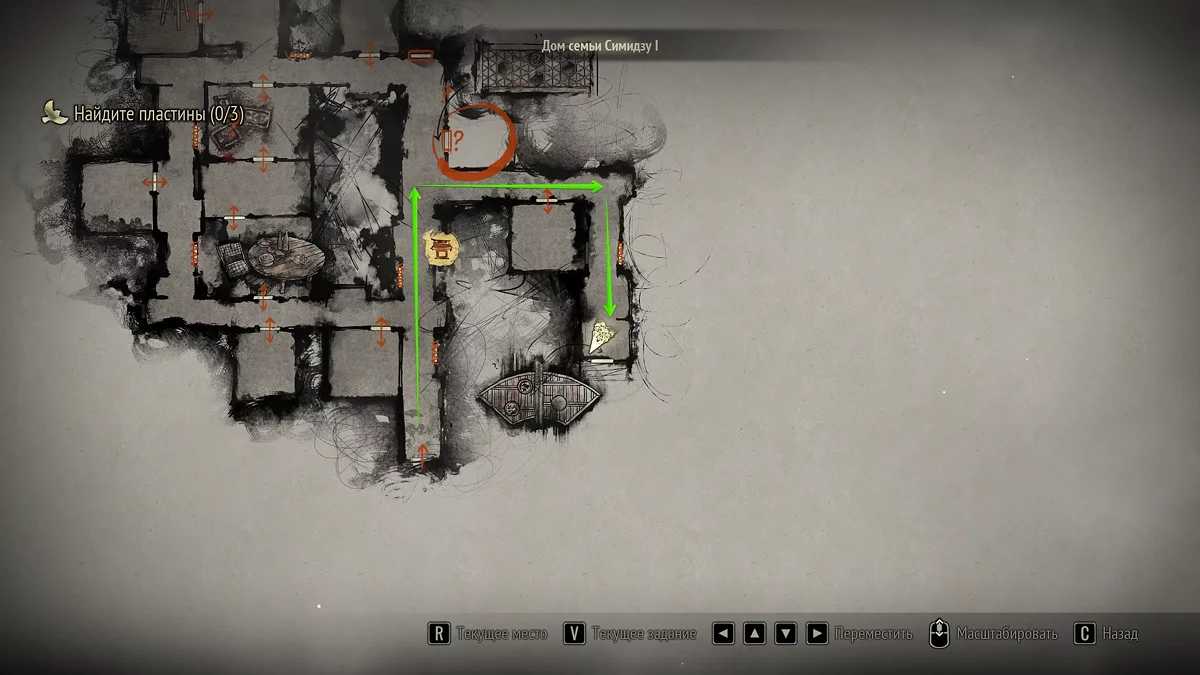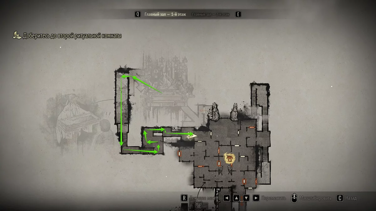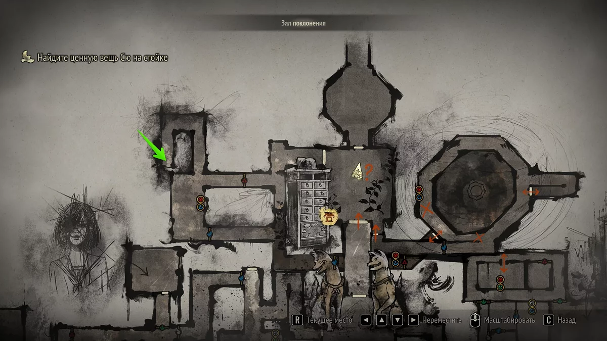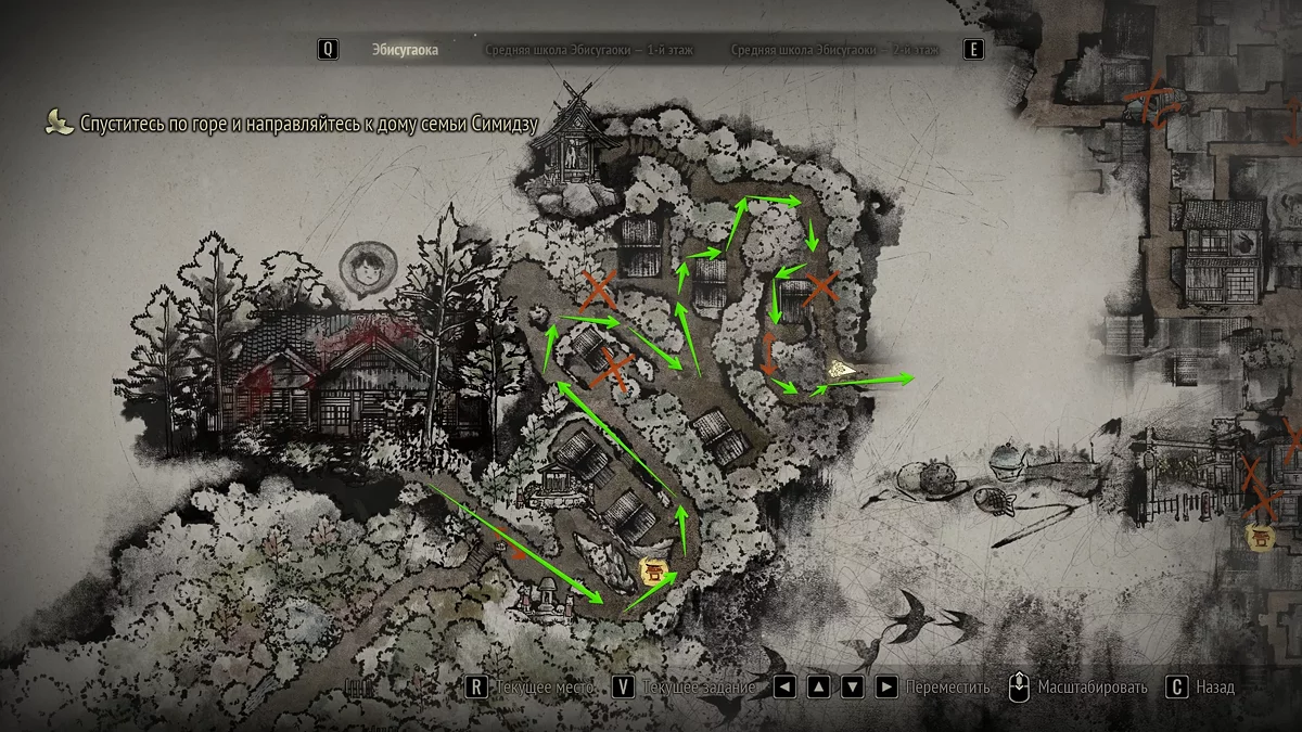 Увійдіть у двері зліва від розпису. Тепер відкрийте ширму у статуї лисиці зліва і витягніть уламок стріли. Пройдіть до кінця коридору і дістаньте з коробки герб з чорним горобцем. Тепер вийдіть з кімнати з вівтарем і перейдіть у приміщення справа. Приберіть стіну в режимі концентрації і пройдіть через ворота справа в зал з фрескою.