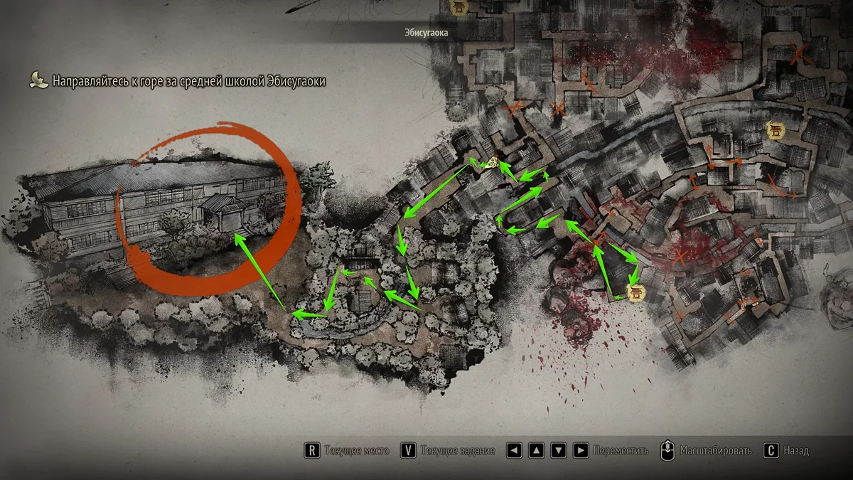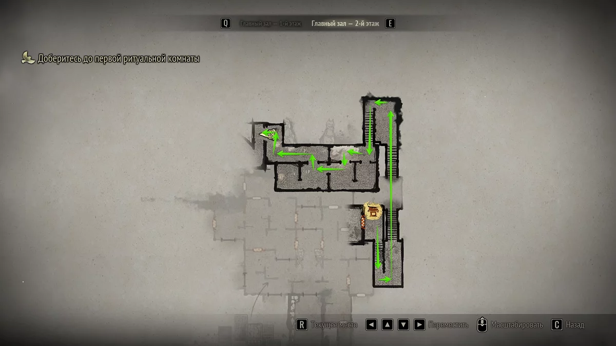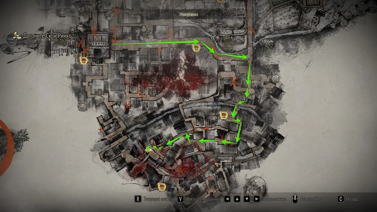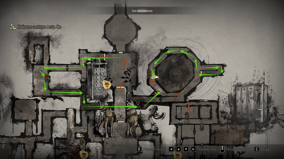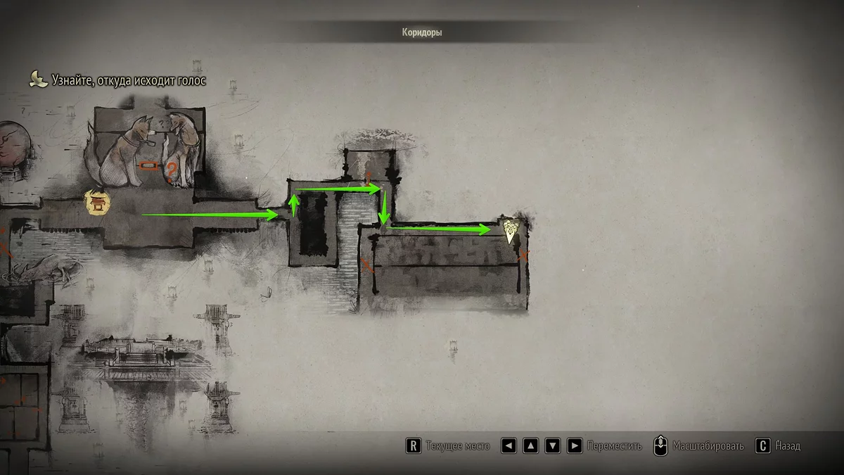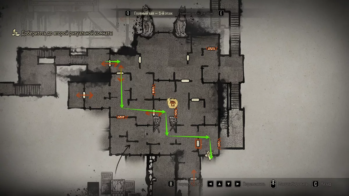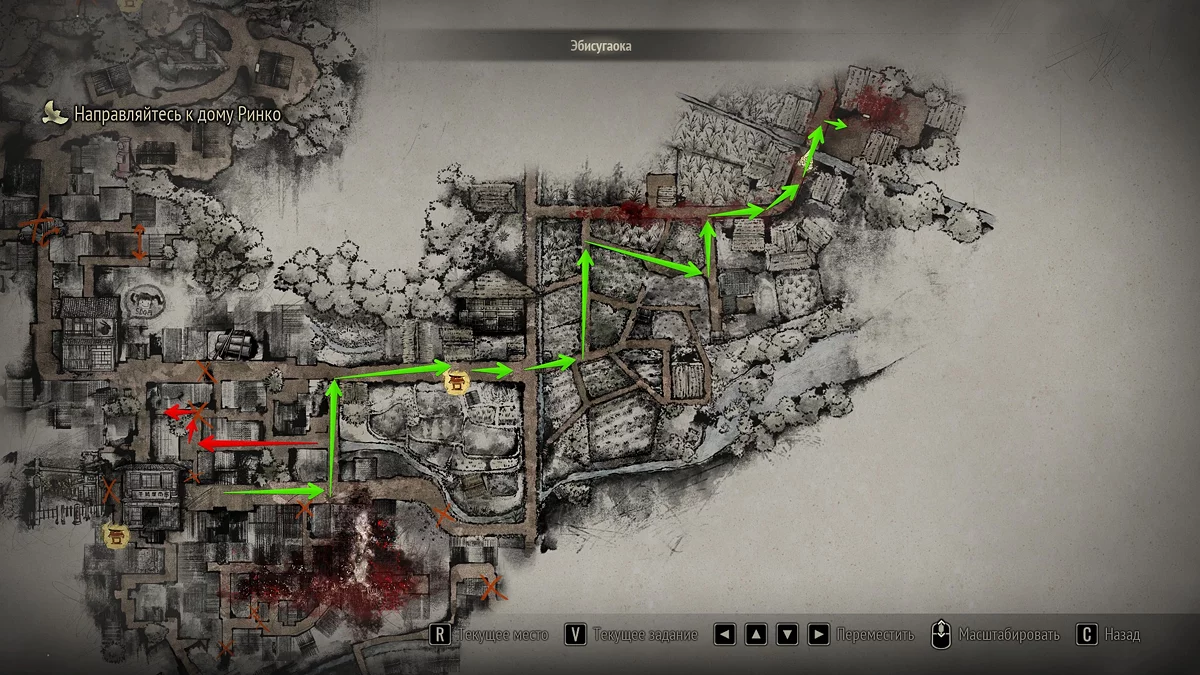 Увійдіть у двері зліва від розпису. Тепер відкрийте ширму у статуї лисиці зліва і витягніть уламок стріли. Пройдіть до кінця коридору і дістаньте з коробки герб з чорним горобцем. Тепер вийдіть з кімнати з вівтарем і перейдіть у приміщення справа. Приберіть стіну в режимі концентрації і пройдіть через ворота справа в зал з фрескою.