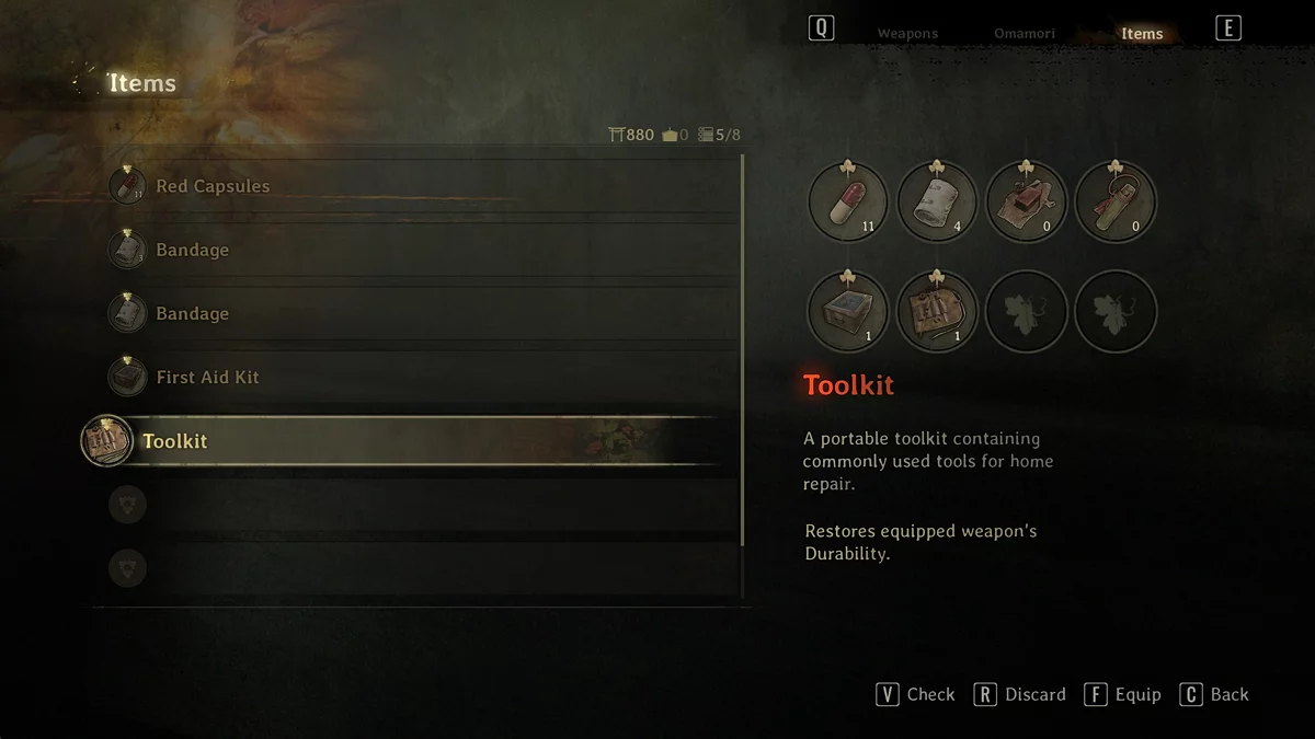 Набір інструментів (Toolkit) — відновлює міцність використовуваної зброї. Коли вона псується, ламається і зникає з інвентаря. Тому намагайтеся ремонтувати озброєння вчасно. Інакше ризикуєте опинитися в ситуації, коли посеред бою ви опинитеся беззбройним.