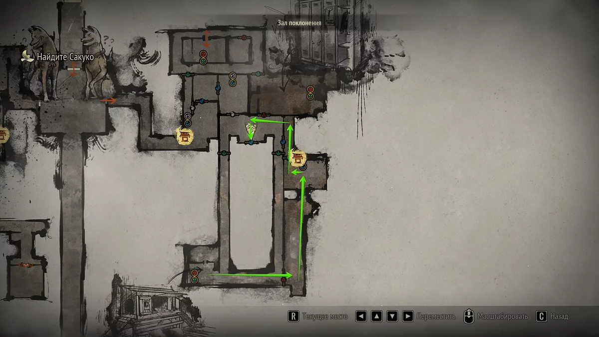 Пройдіть через двері навпроти фрески і потрапите в кімнату з монументами. Підійдіть до ореолу з крові, створіть статую Інарі в режимі концентрації і витягніть стрілу з шиї. Виберіть ширму, на яку вкаже скульптура. Вбийте в кінці коридору гіганта і трьох мечниць. Заберіть герб з білим горобцем і поверніться до зали з розписом.