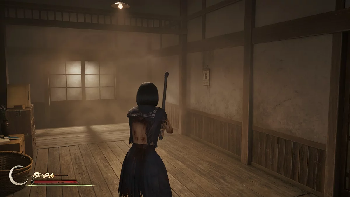 Щоб втекти від чудовиська, увійдіть у будинок. Підніміться на другий поверх, відкрийте двостулкові двері, зайдіть за кут зліва. Подивіться вниз і огляньте маску, що лежить у складеному матраці. З неї героїня витягне кривавий ключ.