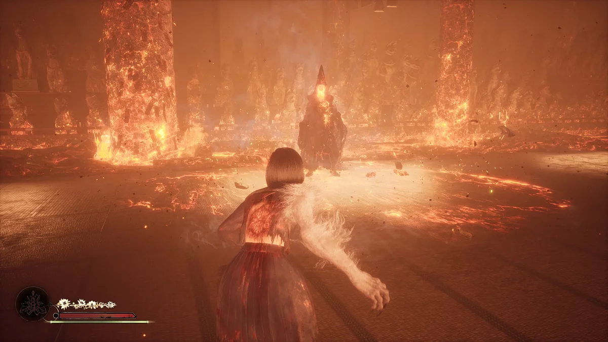 Після катсцени темний простір заллється червоним туманом. Вирушайте до місця, куди чоловік у масці лисиці привів героїню після отримання кайкена. У скарбниці та на шляху до статуй з’являться три монстри. Вбивати їх не обов’язково, просто підійдіть до дверей.