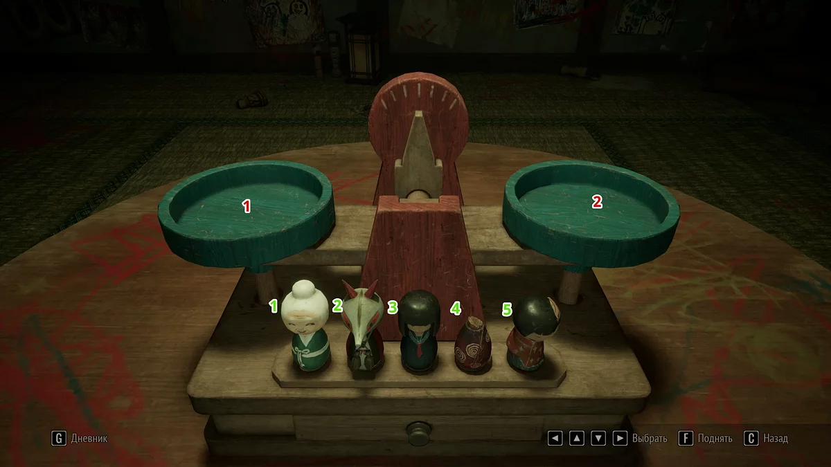 Підійдіть до столика і побачите ваги з п’ятьма фігурками. На стіні навпроти дверей висить записка: