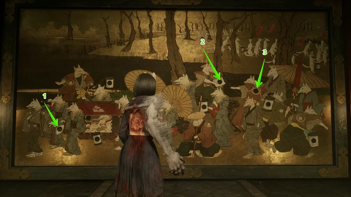 Для вирішення головоломки потрібно знайти три герби і вставити їх у отвори в розпису. Щоб отримати медальйони, необхідно з залу з фрескою потрапити в кімнату зі статуями Інарі. Потім слід знайти правильний монумент і витягти з нього уламок стріли. Після цього скульптура повернеться до правильної двері. Якщо ви пройдете через неправильну ширму, опинитеся в приміщенні з монстрами, яких доведеться вбити, щоб повернутися назад.