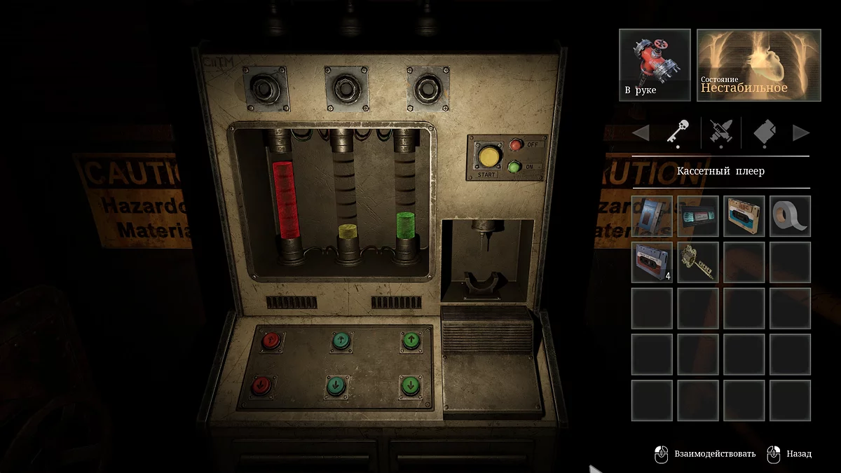 Спустіться в підвал і пройдіть у лівий кут кімнати з конвеєрами. Там буде знаходитися автомат з трьома рідинами: червоною, жовтою і зеленою. Налийте певний рівень кожної рідини:
