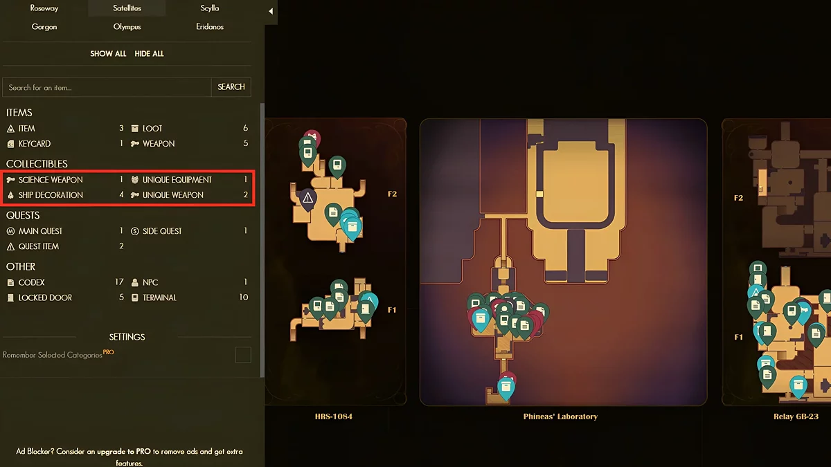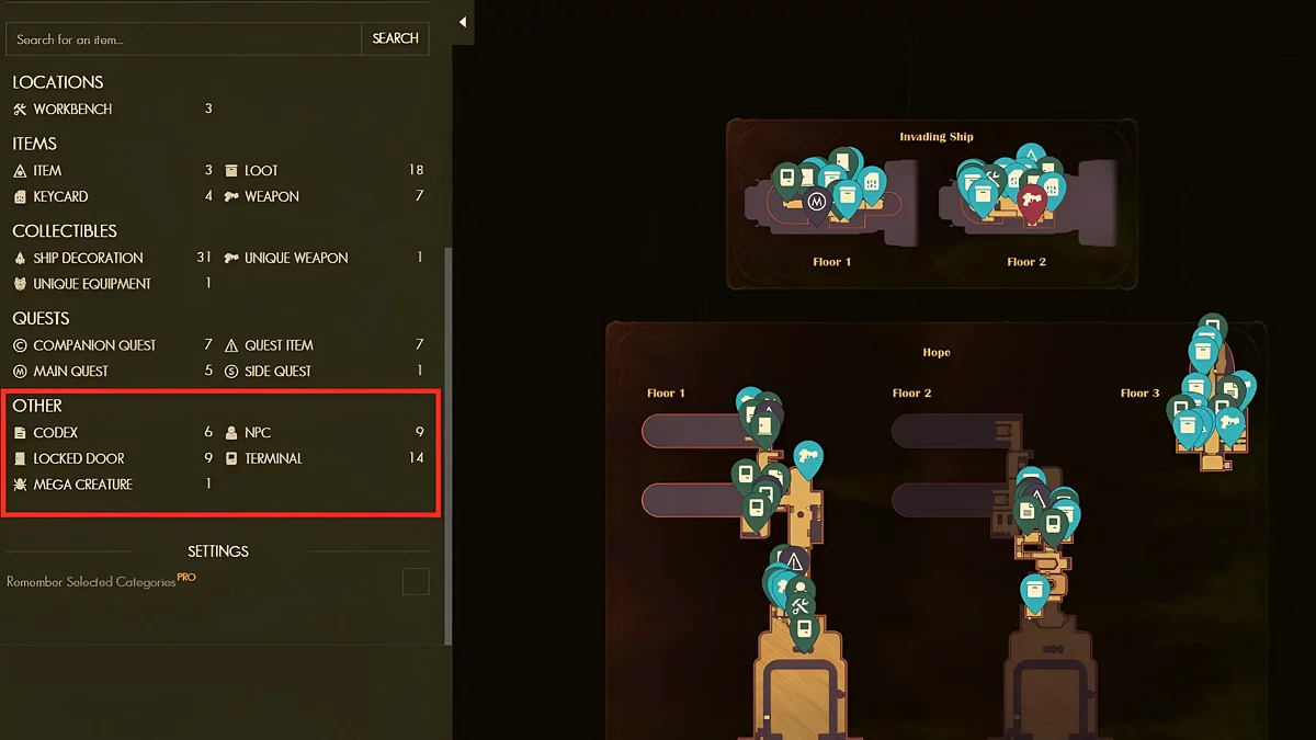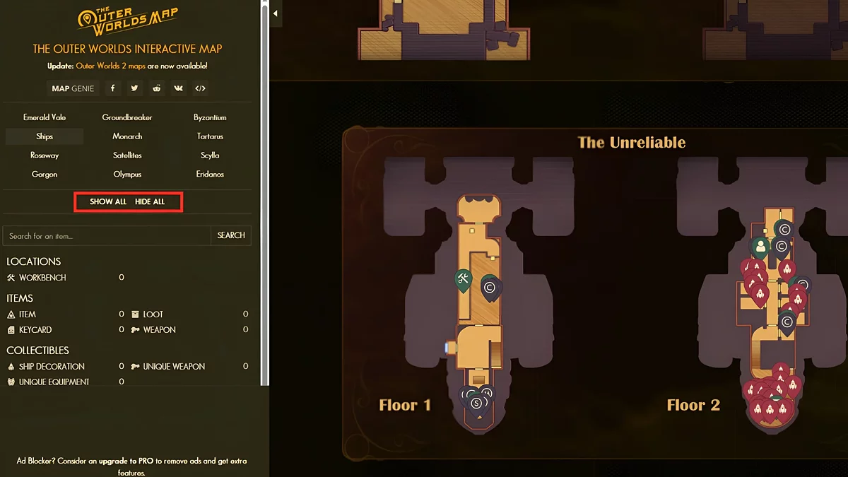 Для управління позначками на карті зверніть увагу на дві кнопки нижче. «Показати все» (Show All) дозволяє відобразити всі іконки, а «Сховати все» (Hide All) — прибрати їх. Якщо ви шукаєте щось конкретне, спочатку краще очистити план локації, а потім поставити той символ, який вам потрібен.
