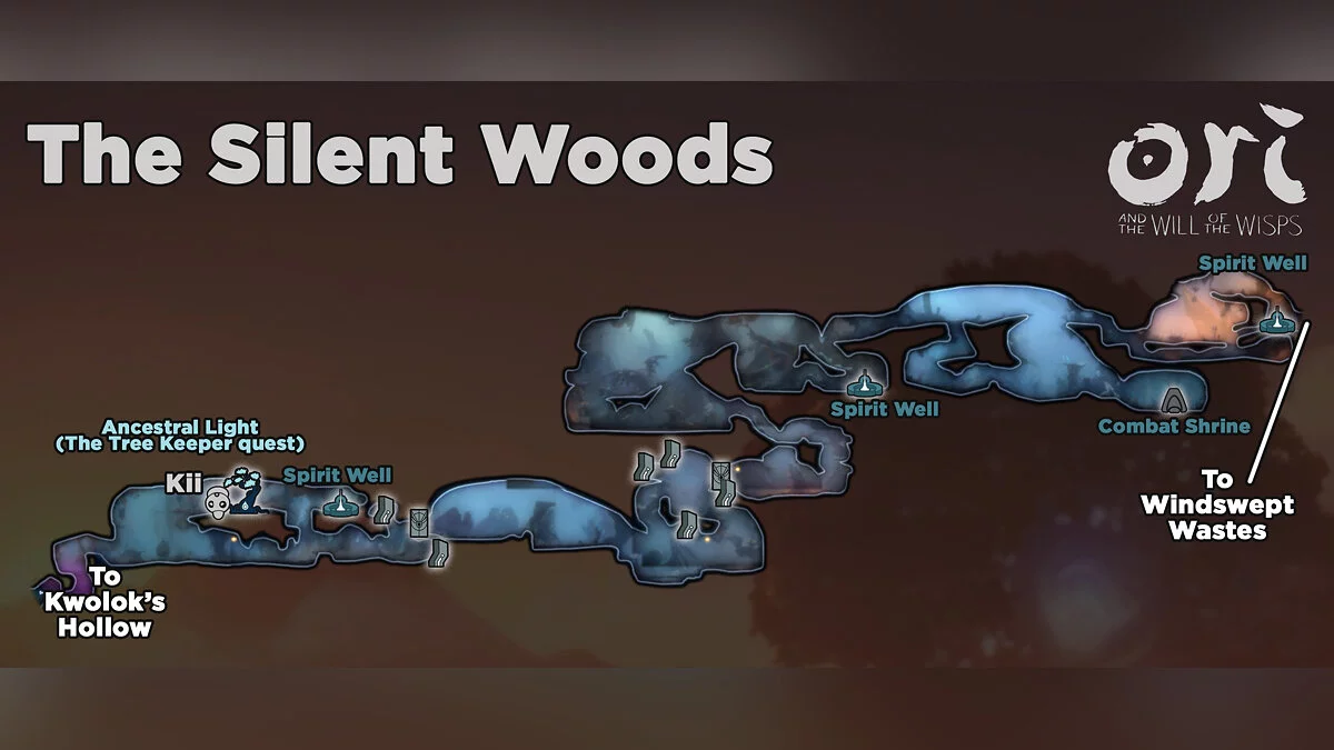 Тихий лес — пятая область, которую вы посетите в Ori and the Will of the Wisps. Она полна трудных врагов и битв с боссами. Здесь можно найти только одно дерево с умением. Познакомьтесь с Кии (Kii), возьмите ветвь и верните ее на локацию «Родниковые поля», вы получите навык «Свет Предков» (Ancestral Light). В этом регионе нет осколков, фрагментов ячейки энергии или жизни. Кии (Kii) — единственный NPC, которого вы встретите здесь.