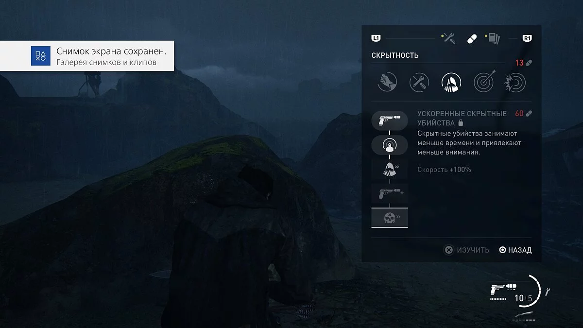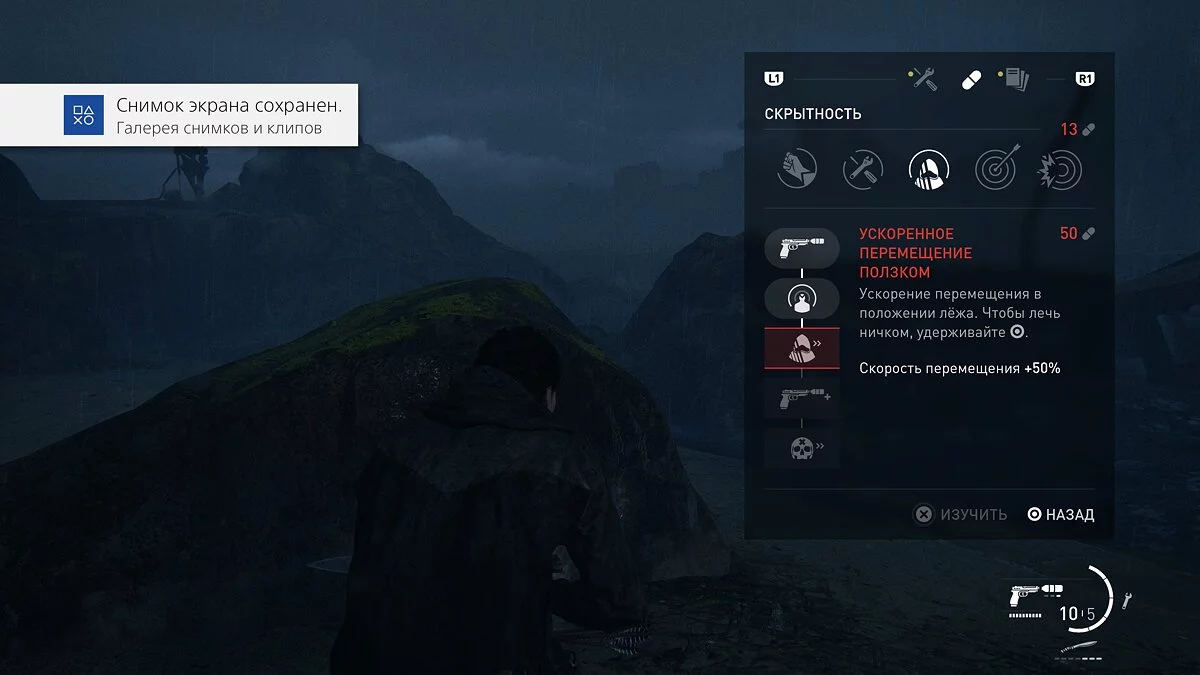 Модифікація «Схованість» дозволяє прокачати наступні навички: «Виготовлення глушників», «Чіткість режиму слуху», «Прискорене переміщення повзком», «Покращені глушники» і «Прискорені сховані вбивства». Можна знайти в главі «Сіетл, день 1 — Кепітол Хілл».