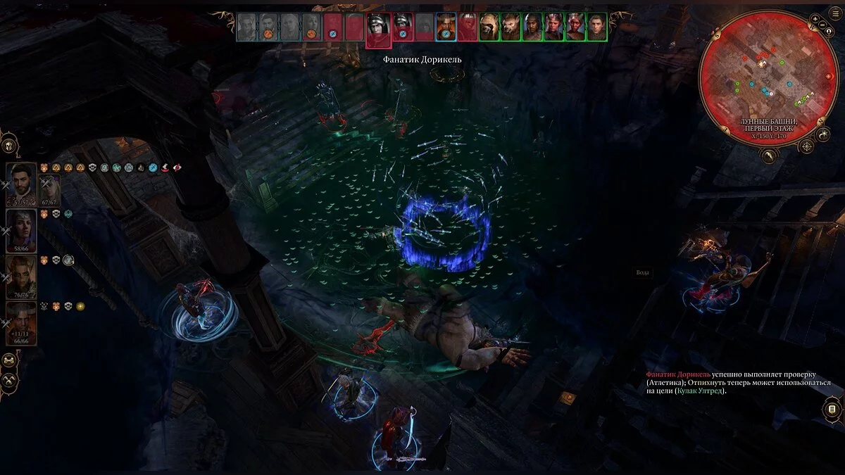 Довольно простой вариант. Ваш отряд с культистами запросто победит Арфистов численностью. Но у низ есть преимущество в более высоком расположении. Воспользуйтесь способностями: «Туманный шаг» или «Рывок, чтобы быстрее взобраться на высоту по ближайшим лестницам.