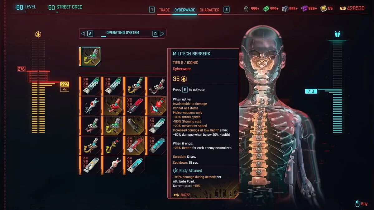• Особенности: при включении эта аугментация даёт неуязвимость, повышает скорость атаки на 30%, уменьшает расход энергии на 100% и дополнительно увеличивает урон, если у вас низкий уровень здоровья (до 50%). Эффективность ваших ударов возрастёт на 0,5% за каждое очко характеристики, которые вложены в Силу. Во время действия Берсерка можно сражаться только в ближнем бою.