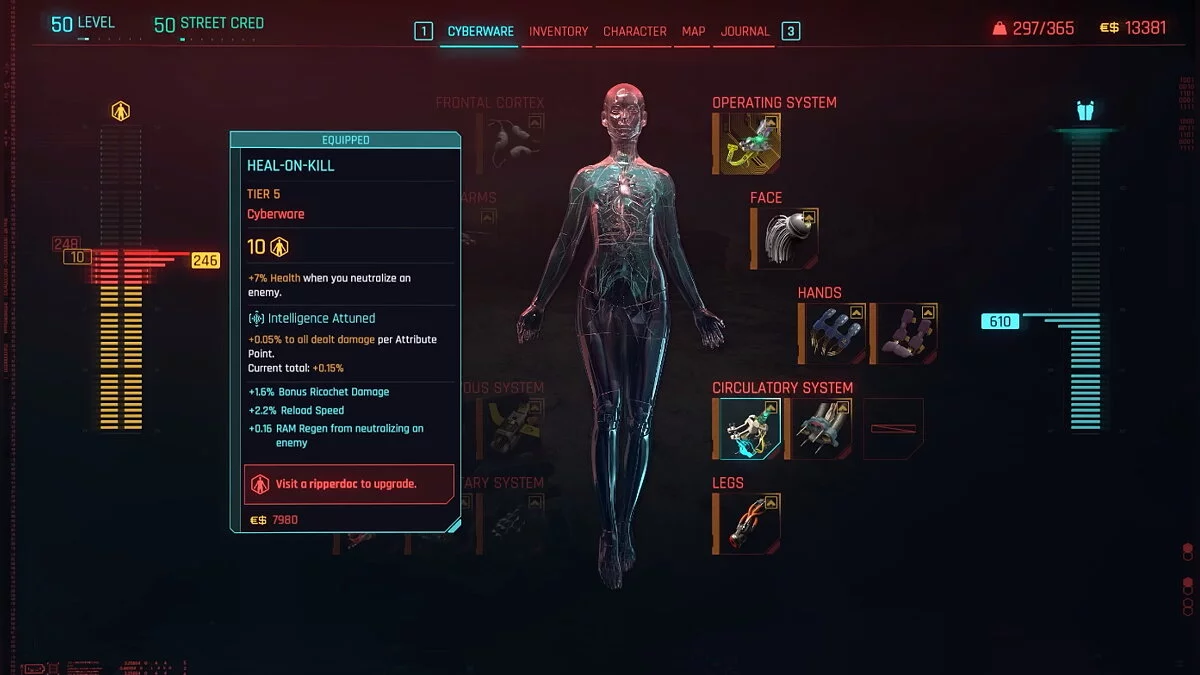 Обратите внимание: Во время установки хрома нужно следить за очками имплантов. Если вы превысите лимит, то получите эффект киберпсихоза. Поэтому установить все самые лучшие модификаторы тела не получится — придётся выбирать между мощной защитой от пуль, замедлением времени и возможностью взламывать вражеских солдат.
