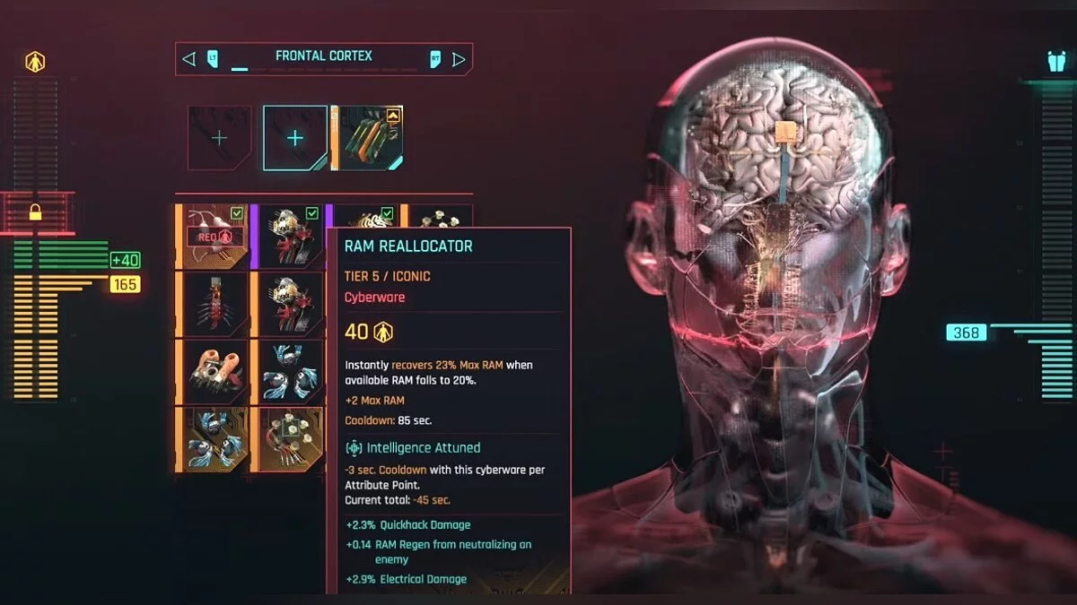 • Особенности: мгновенно восстанавливает 23% объёма памяти кибердеки, если его осталось меньше 20%. Время восстановления способности — 65 секунд. Перезарядка всех скриптов будет меньше на 3 секунды за каждое очко характеристики Интеллекта.