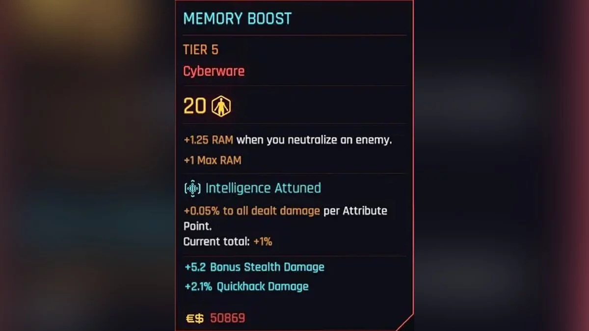 • Примечание: значительно увеличивает восполнение памяти. Для этого даже не обязательно устранять противников при помощи скриптов — достаточно выстрелить в него или убить в режиме скрытности. Оптимальный выбор для нетраннера.
