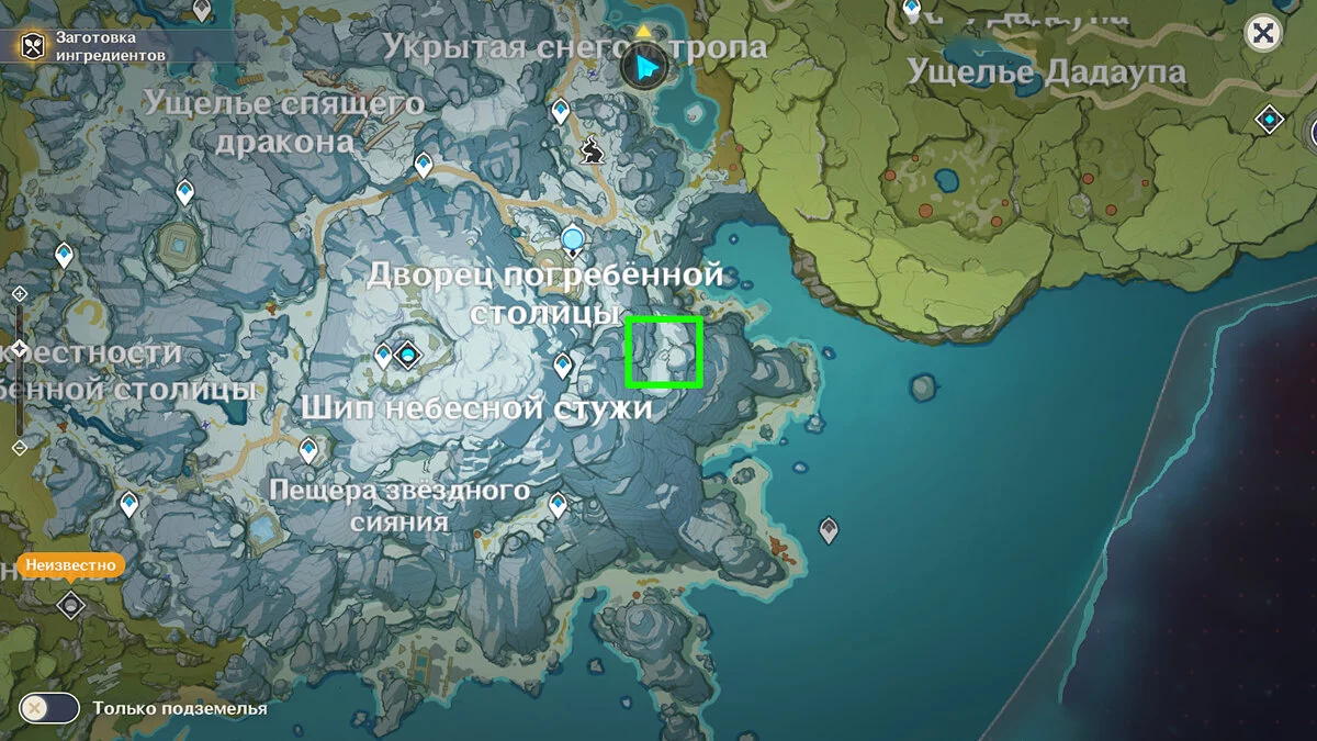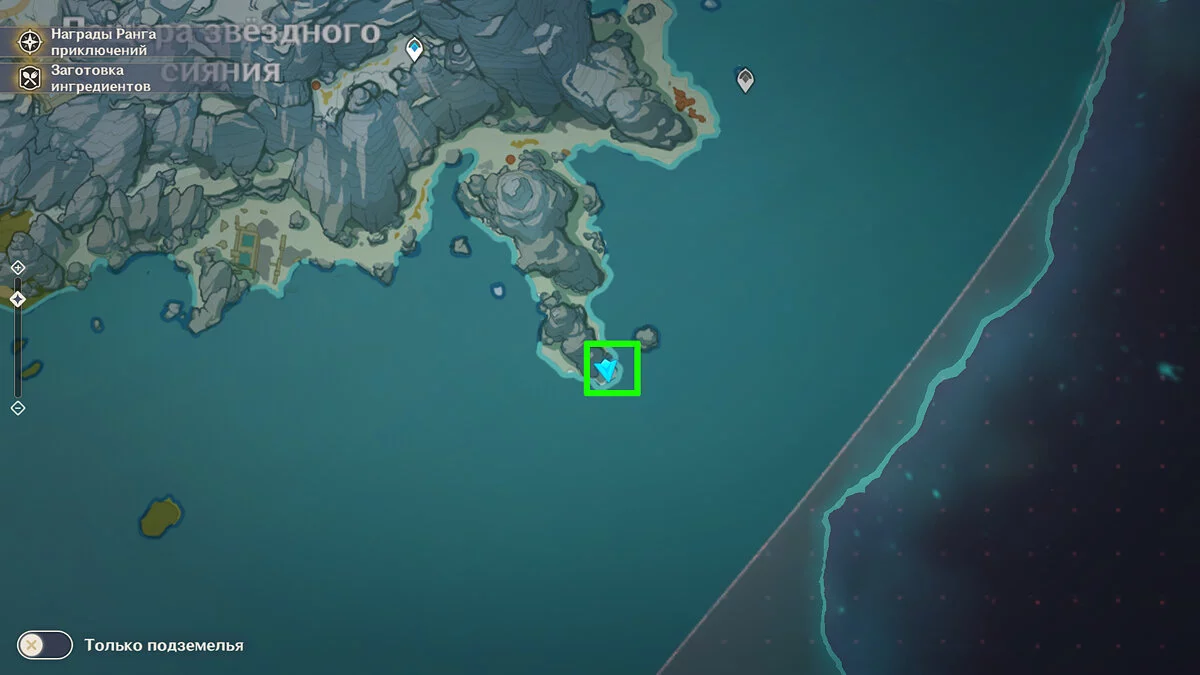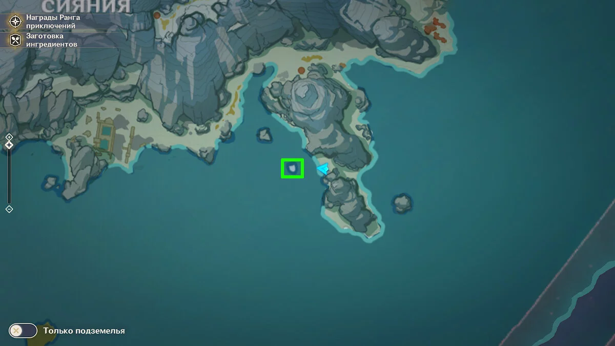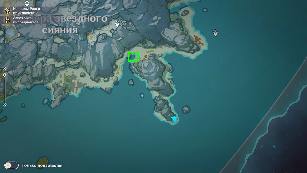Если добраться до отмеченного на карте места, то вы увидите каменный мост через воду, а также устройство рядом с ним. Чтобы избавиться от воды и спуститься в пещеру, отыщите четыре колонны, которые нужно активировать крио-способностями (подойдёт стартовый персонаж — Кэйа).