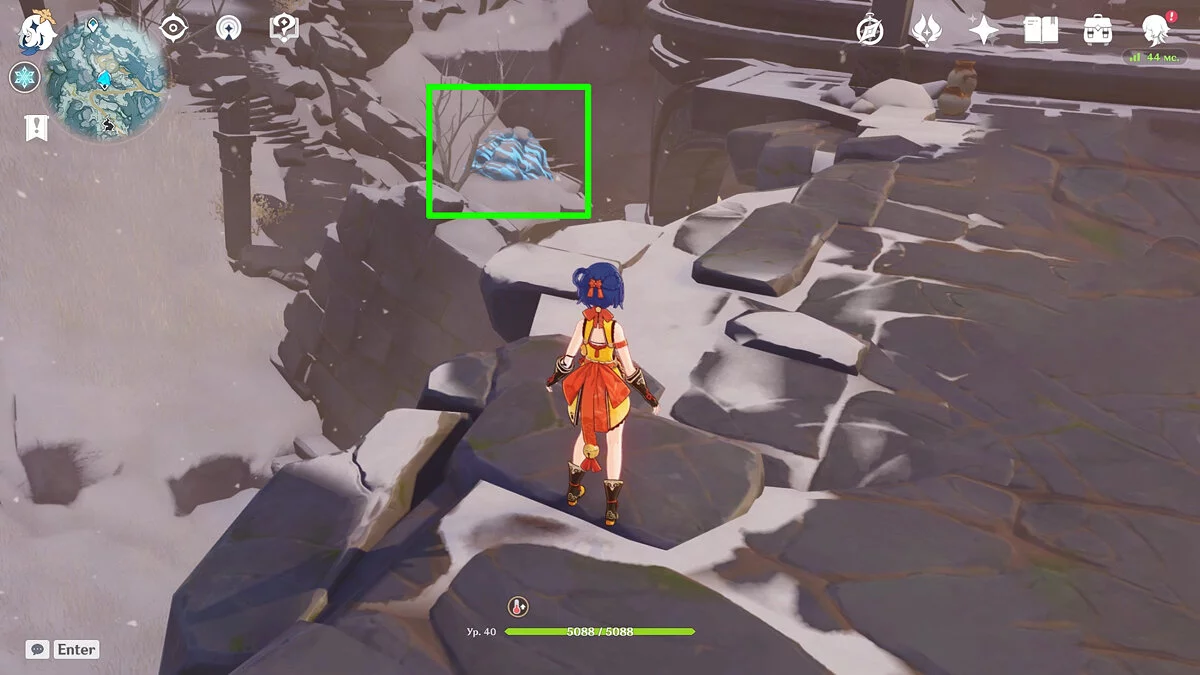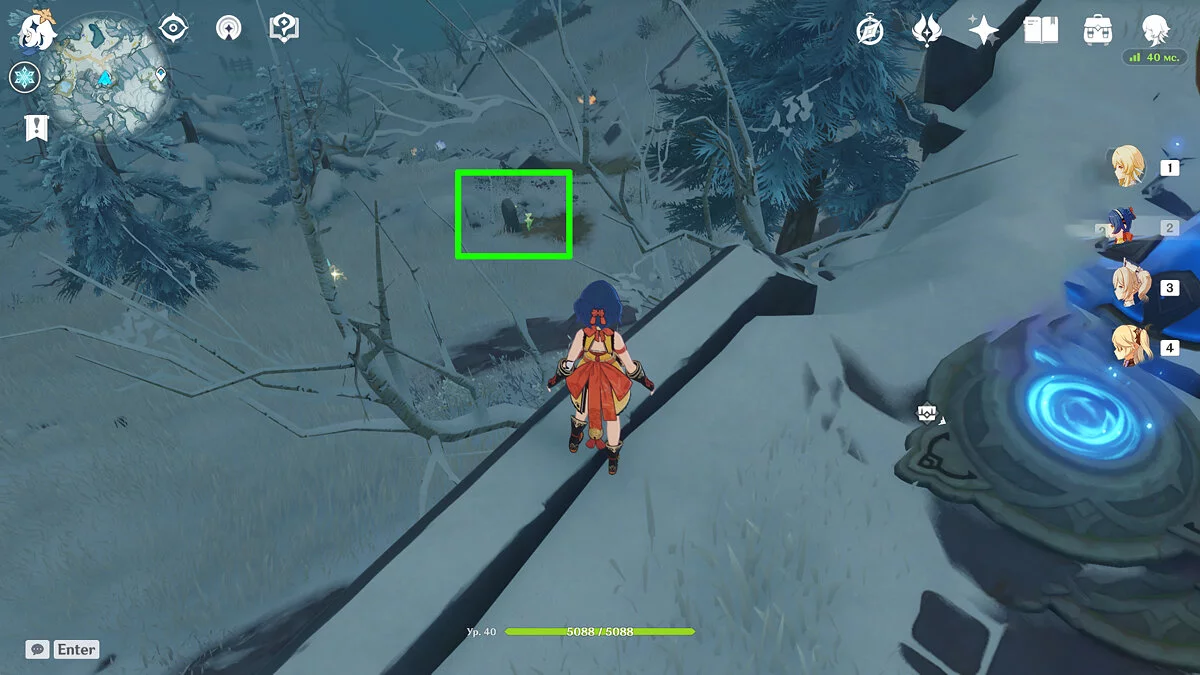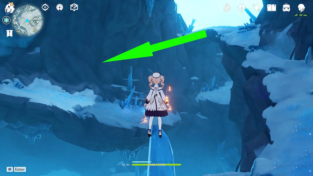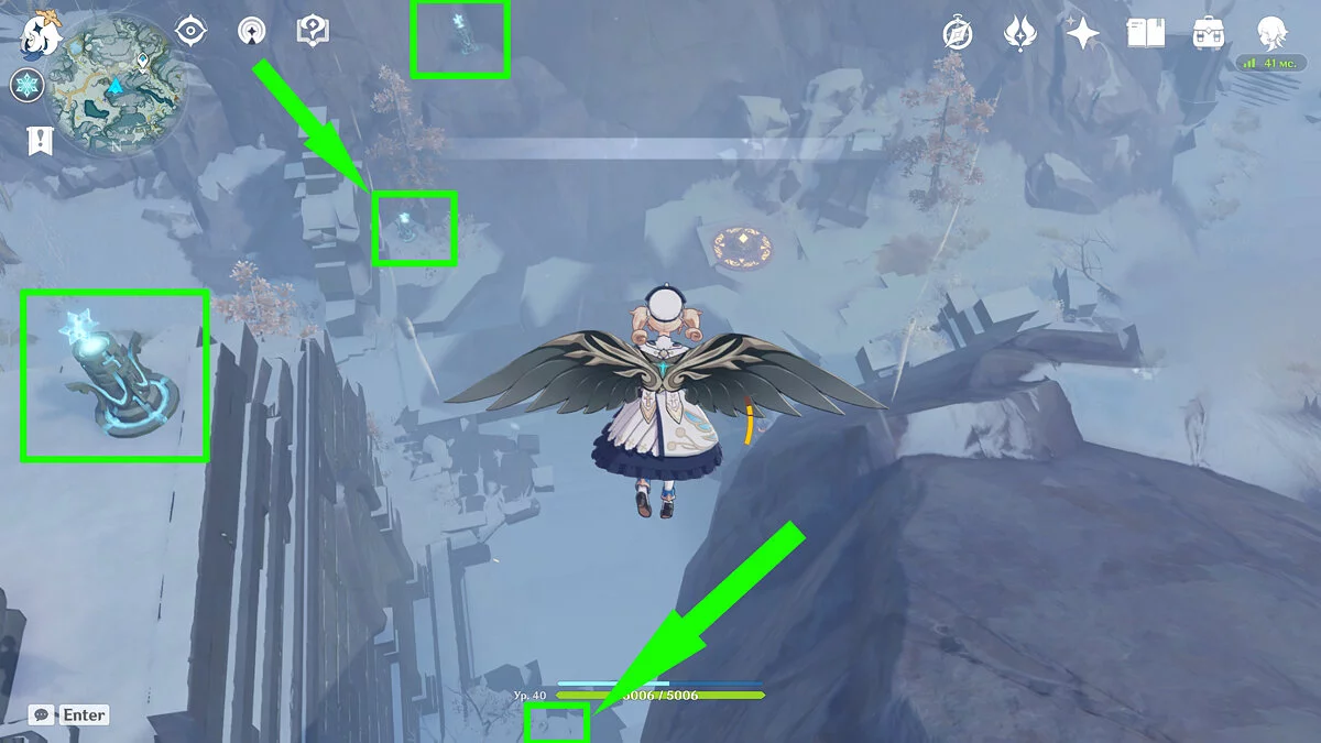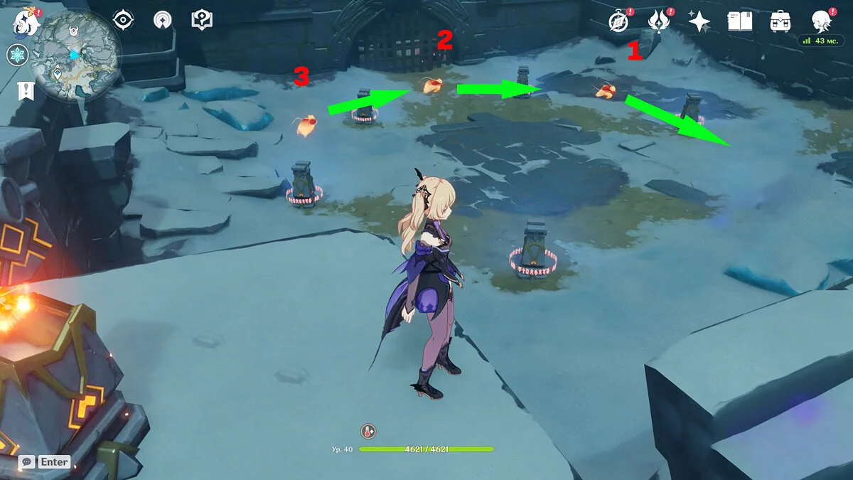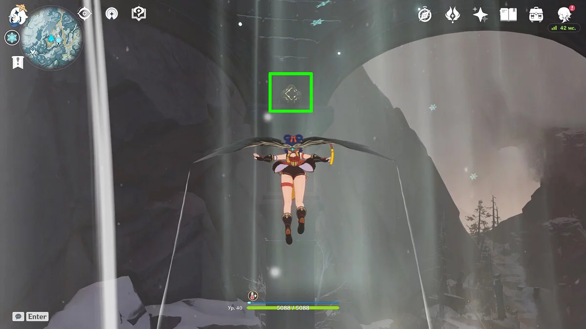 Когда вы разблокируете статую семи Архонтов в этом регионе, осмотрите местность и найдите обледенелое устройство. Разрушить лёд можно при помощи алого кварца. Сделав это, активируйте его и осмотрите центральную часть круглой площадки. Вместе с активацией устройства здесь появится воздушный поток, который позволит вам добраться до трёх кнопок на колоннах.