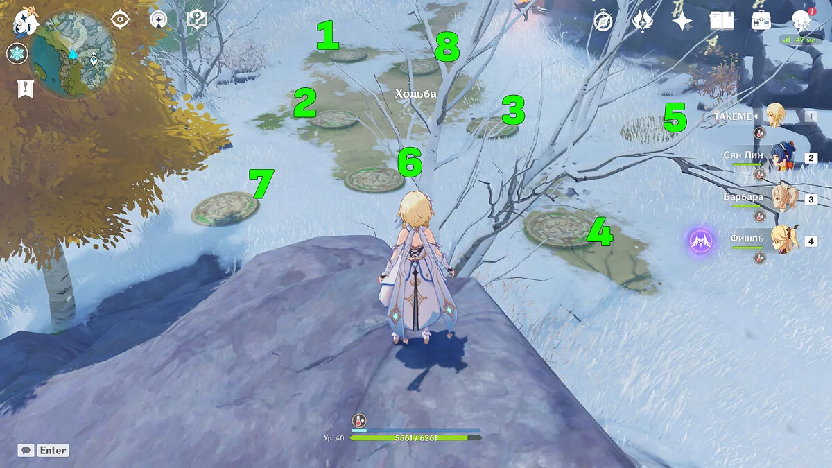Добравшись до телепорта, бегите на север и не забудьте прихватить с собой камень алого кварца, так как с его помощью нужно будет разрушить ледяную глыбу, которая блокирует доступ к одной из плит. Избавьтесь от двух шаманов и начните разгадывать секрет. Чтобы получить награду, вам нужно наступать на плиты в правильном порядке. Мы подготовили скриншот с указанием верной последовательности.