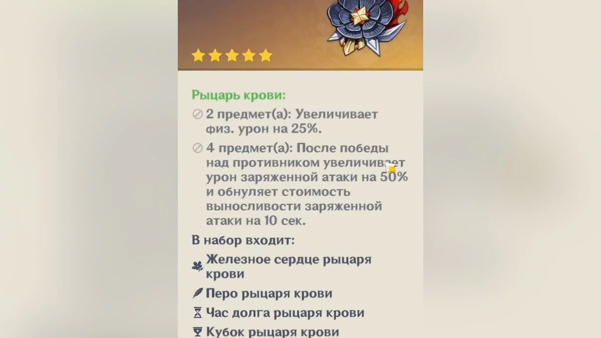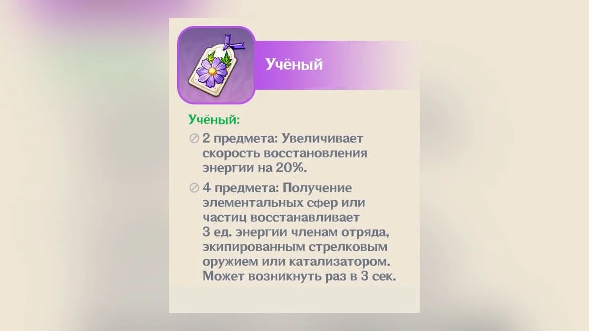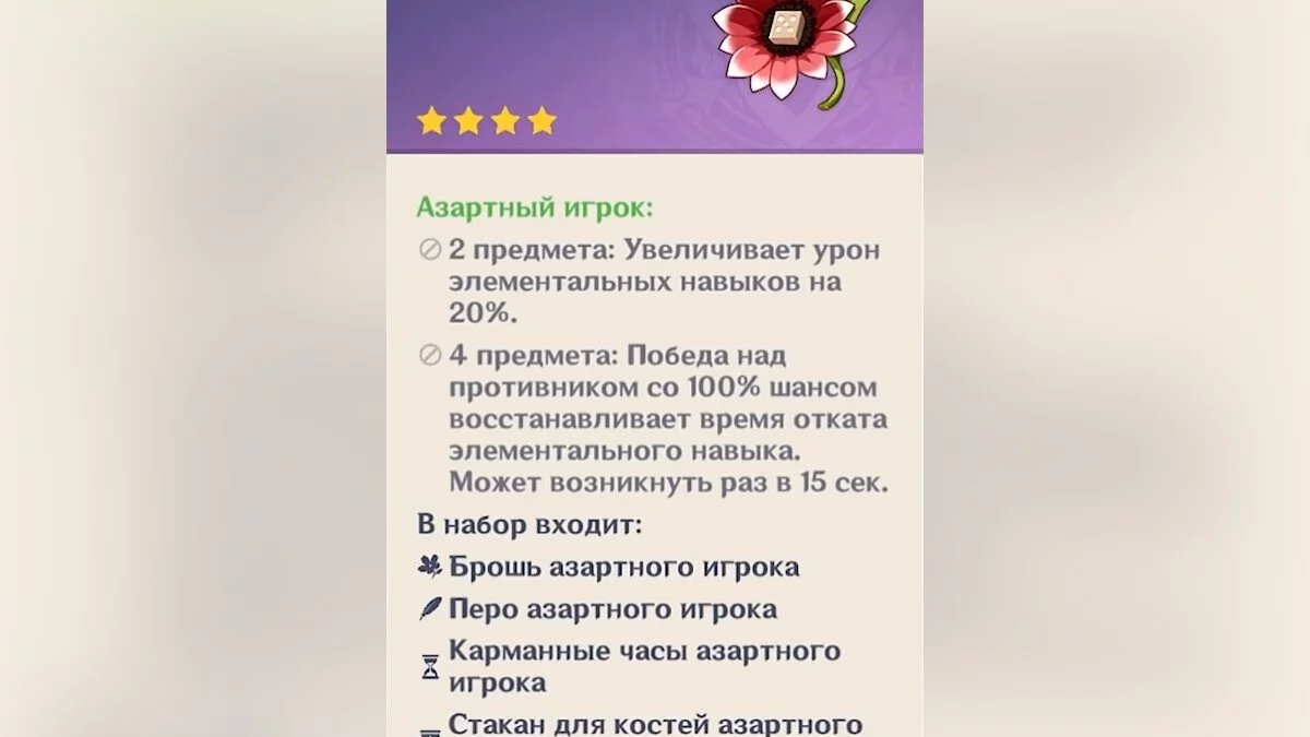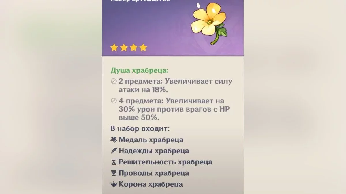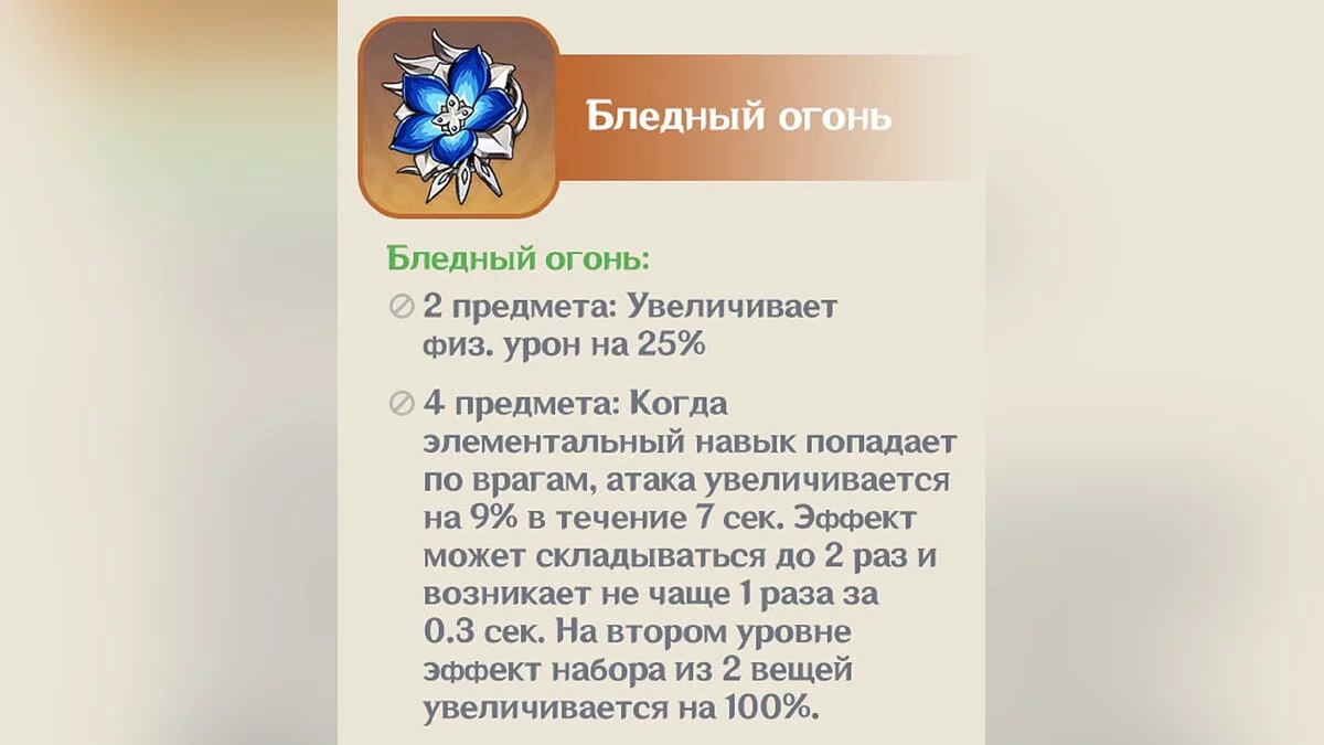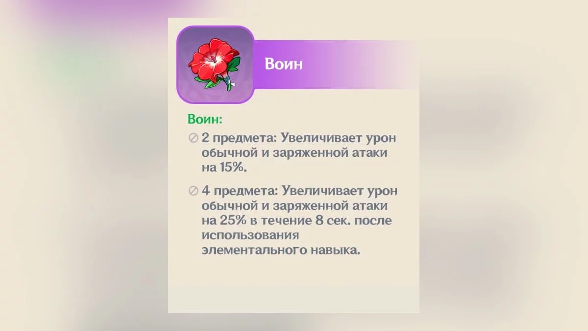 - 4 предмета: увеличивает урон обычной и заряженной атаки на 30% в течение 15 секунд после использования элементального навыка.