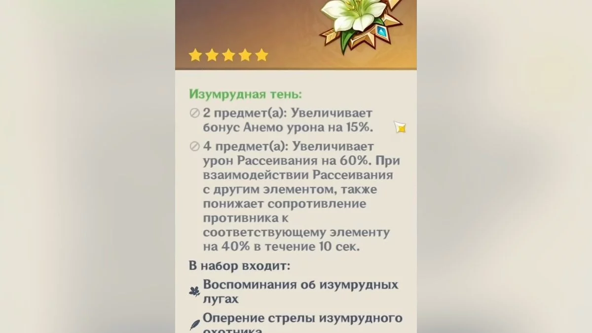 - 2 предмета: увеличивает бонус Анемо-урона на 15%.