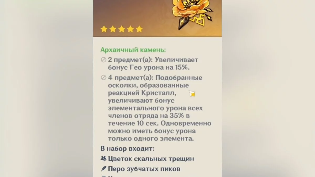 - 2 предмета: увеличивает бонус Гео-урона на 15%.