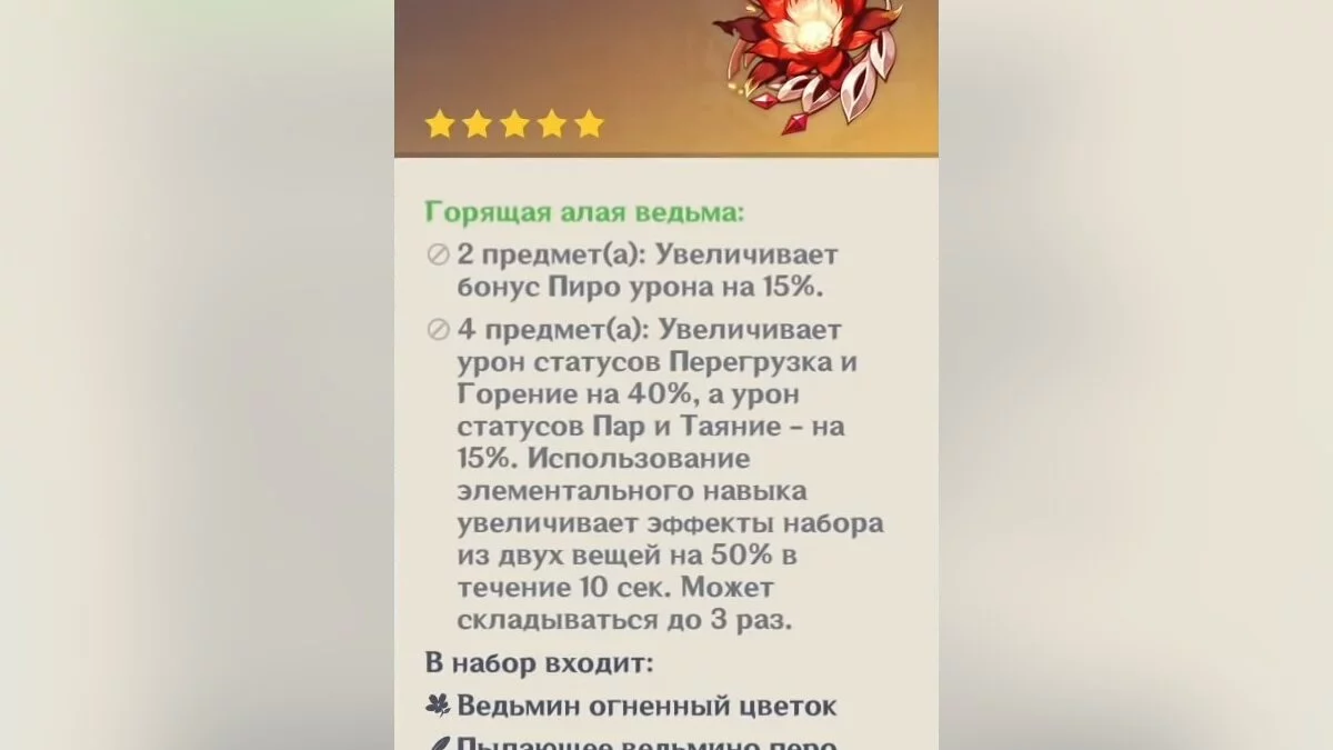 - увеличивает урон статусов «Перезагрузка» и «Горение» на 40%, а урон статусов «Пар» и «Таяние» — на 15%. Использование элементального навыка увеличивает эффекты набора из двух вещей на 50% в течение 10 секунд. Может складываться до 3 раз.
