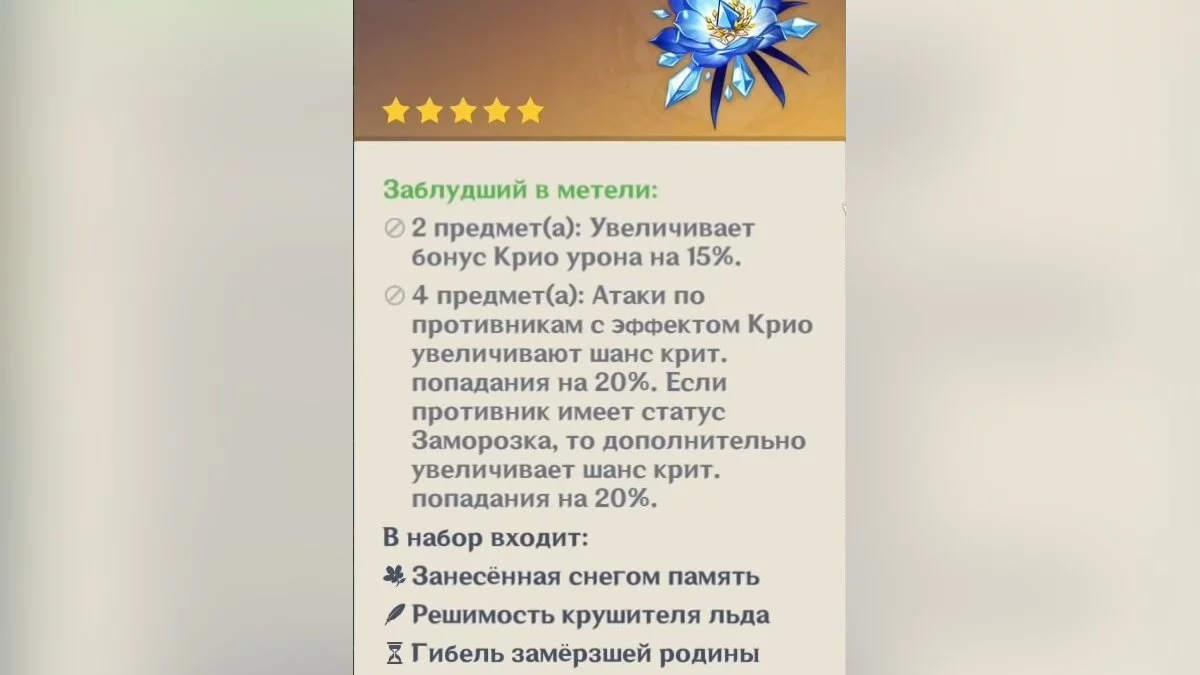 - 4 предмета: атаки по противникам с эффектом Крио увеличивают шанс критического попадания на 20%. Если противник имеет статус «Заморозка», то дополнительно увеличивает шанс критического попадания на 20%.