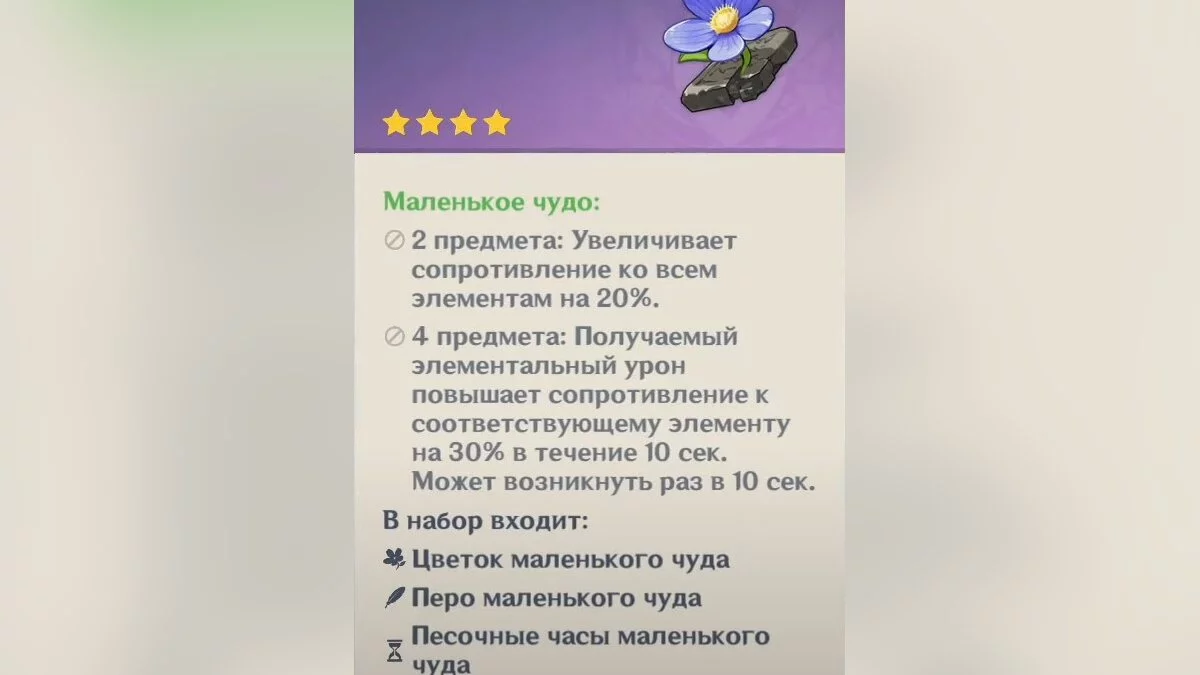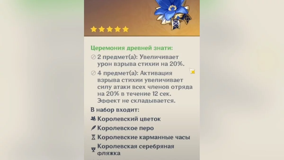 - 4 предмета: увеличивает получаемое лечение всех членов отряда на 20% в течение 10 секунд после использования элементального навыка или взрыва стихии.