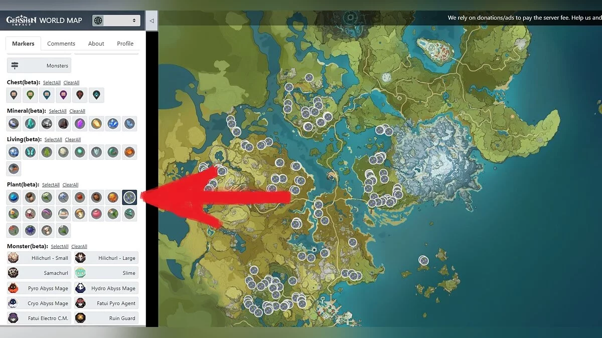 Интерактивную карту можно открыть по ссылке. Чтобы увидеть, где находятся стеклянные колокольчики, откройте меню слева и найдите пункт «Растение» (Plant). Нужный вам вид цветов находится в верхнем ряду, справа.
