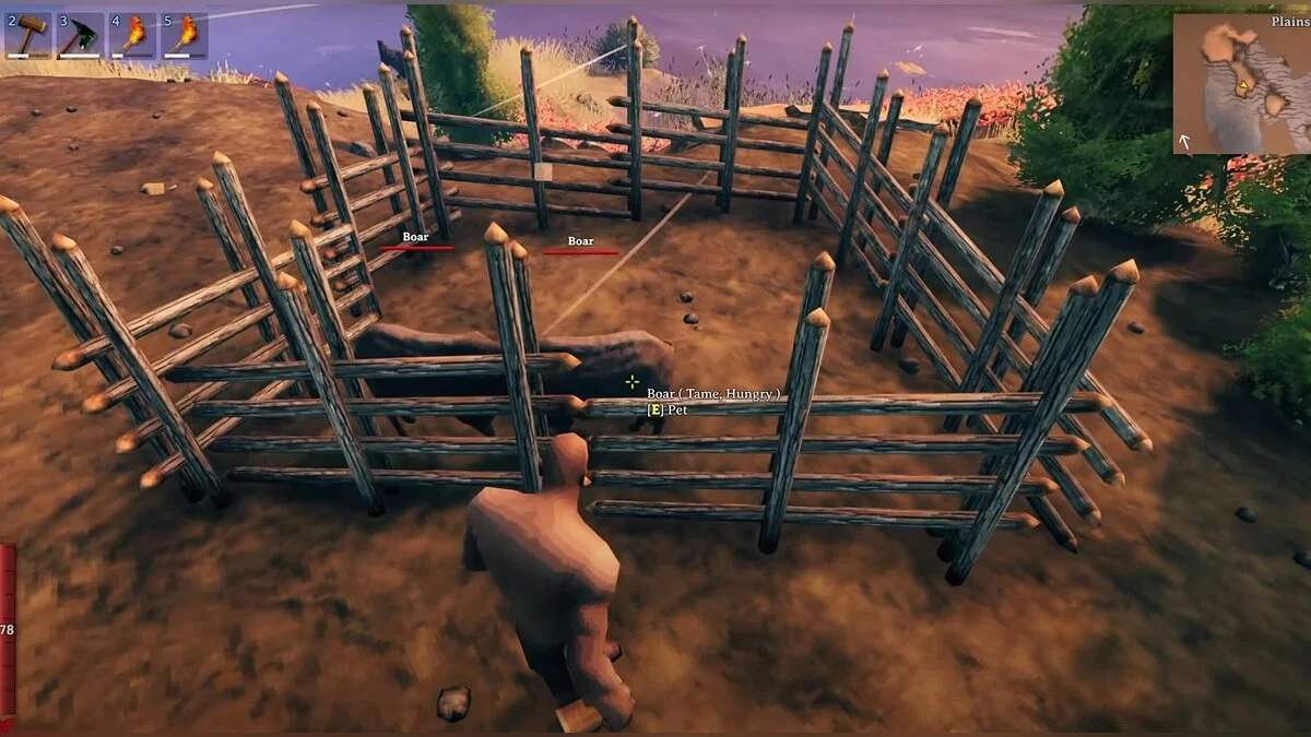 Прежде чем искать кабанов, сначала постройте загон. Для этого откройте меню «Строительство» (Building) и выберите «Ограду из дерева» (Roundpole Fences). Вам нужно поставить забор по всему периметру загона, но оставить небольшое «окно», куда мог бы забежать кабан. Затем отправляйтесь на поиски животного. Найти его можно в биоме лугов, около водоёмов, заброшенных построек и мест, где растёт бук.