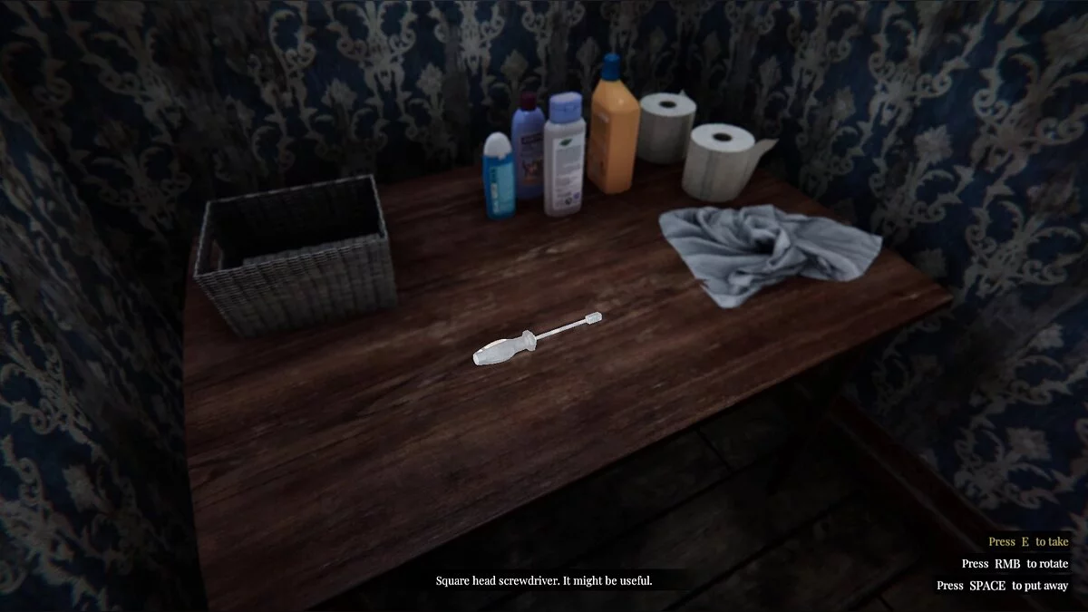 Спуститесь на первый этаж, чтобы получить новое задание. В уборной на втором этаже осмотрите шкафчик, заберите таблетки и отнесите их в зал на первом этаже. У входа обыщите ящик и заберите свои вещи.