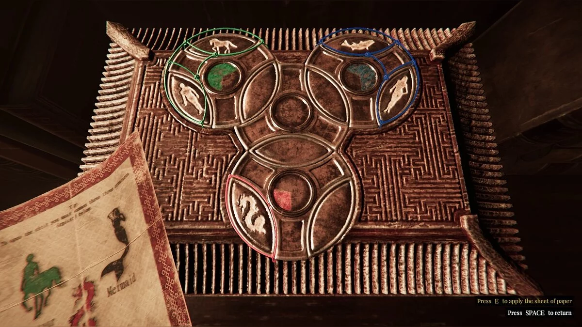 Найдите зажигалку на кухне и зажгите свечу в гостиной. Осмотрите запертую дверь в чулан, затем подойдите к шкатулке в гостиной. Откройте левую дверь шкафчика и возьмите листок с подсказкой. Вам нужно соединить изображения человека и коня в зелёном кругу, девушки и рыбы в синем кругу, а дракона поместить в красный круг.