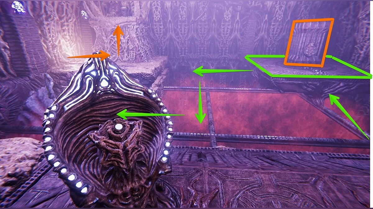 Бегите вперёд, затем поднимитесь наверх и взаимодействуйте с вратами. Вам нужно использовать активные элементы на вратах, чтобы собрать такое же изображение, как на рисунке в вашем инвентаре. Для подсказки используйте наш скриншот ниже.