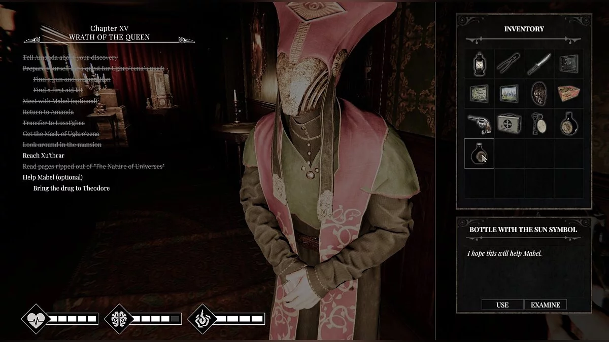 Если выберите помочь Мэйбл, то поговорите с девушкой и прочтите записи на туалетном столике в её комнате. Вернитесь к Теодору и расскажите о том, что с ней случилось. Жрец даст вам ключ от чердака. Найдите здесь несколько склянок с лекарством и вернитесь обратно к Мэйбл. Отдайте лекарства, чтобы завершить побочное задание.