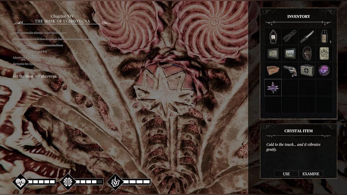 Поднимитесь к стойкам для трёх сфер и поместите сюда найденные предметы. Стена сдвинется и откроет доступ к лаве, которая позволяет сделать узников падшими. Выстрелите в неё из револьвера, вернитесь в главный зал и заберитесь по лестнице в соседнее помещение с единственным узником. По такому же принципу заманите его в пещеру с корнями и убейте. В главном зале поднимитесь наверх и заберите маску Угроэкны.