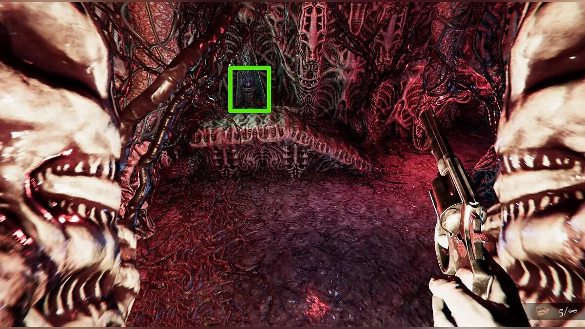 Неважно, откуда вы начнёте свой путь. В первом случае за дверью вы встретите одного врага и подберёте обычную кисть. Во второй комнате нужно передвинуть шкаф и пройти по мостику. Так вы сможете добраться до трупа, в руках у которого находится ручка от лебёдки. Используйте её, чтобы спустить труп и забрать первую золотую кисть. В блоке с камерами замените обычную кисть на золотую, только затем можно прочесть записку, о которой мы упоминали ранее.
