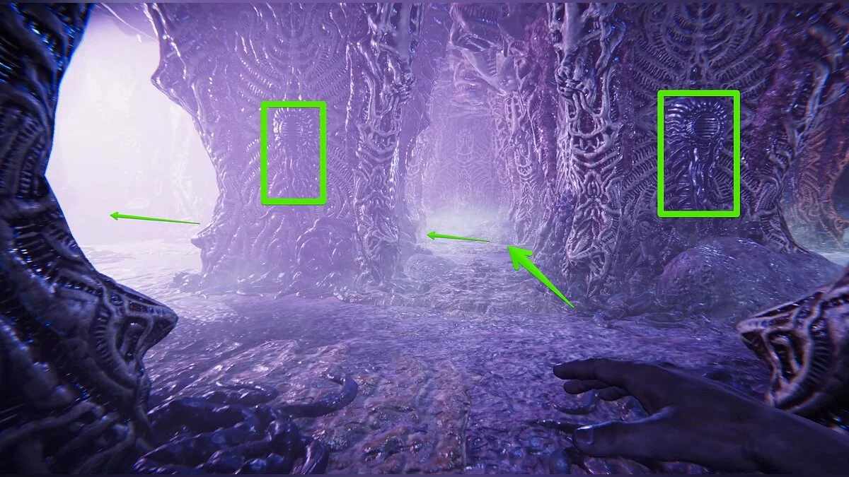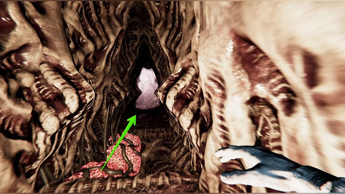 Пройдите мимо мученика с золотыми рёбрами и поднимитесь наверх. Слева от гигантского существа с руками подберите нож для платформы и отодвиньте её в сторону. Теперь падший пленник сможет пройти за вами, если вы поглотите эссенцию. Убейте существо рядом с корнями растения, чтобы открыть проход выше.