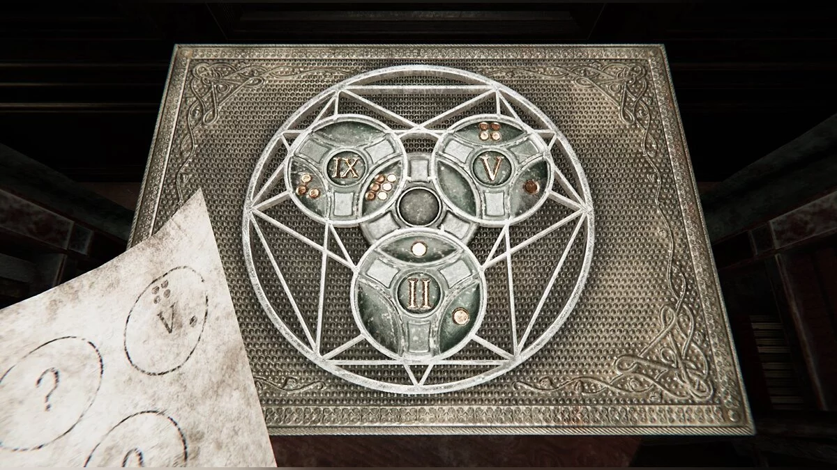 В этой же комнате, слева от стола откройте ещё одну штору, за которой находится головоломка. Осмотрите выдвижной ящик стола, чтобы найти подсказку для её решения. Также вы можете использовать правильную комбинацию, представленную на скриншоте ниже. Сделав это, заберите второй красный камень.