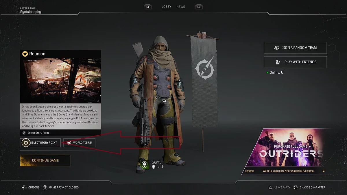 Пройдите вступление Outriders и доберитесь до точки, где вам нужно отправиться в Первый город (First City). Нажмите «Параметры» и вернитесь в лобби. В лобби перейдите к выбору задания. Выберите Рифт-Таун (Rift Town), затем подзадание, в котором нужно сразиться с Измененным в башне (Altered at the Tower). Нажмите «Продолжить игру».