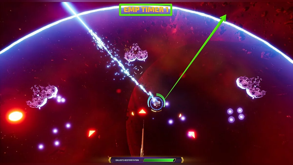 Когда шаттл запустит электромагнитное импульсное оружие, в верхней части экрана появится надпись «EMP TIMER» и отсчёт времени до его активации. Вам нужно покинуть отмеченную зону до того, как таймер достигнет нуля, иначе ваш корабль будет уничтожен вместе с кораблями врагов.