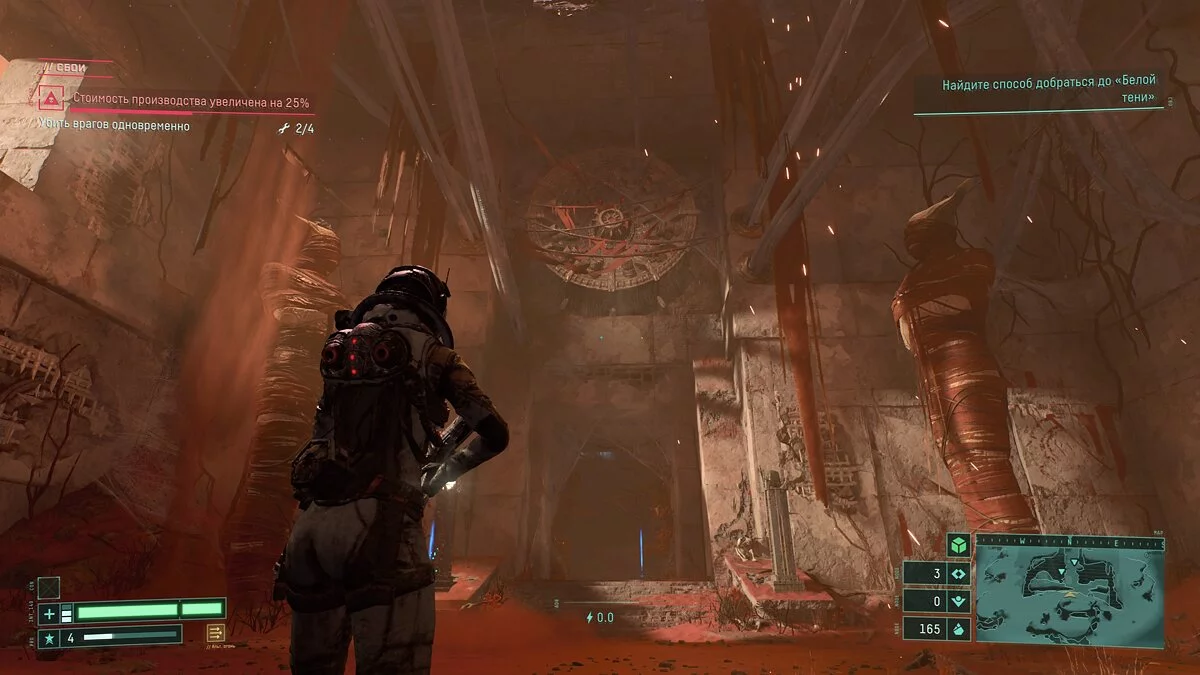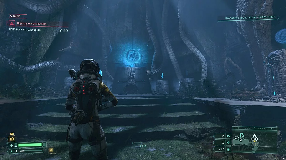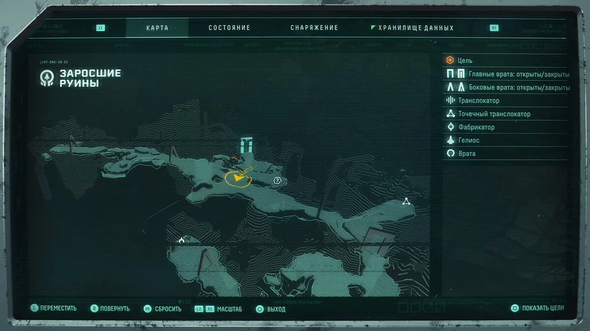 Основная цель будет удобно отображаться на карте оранжевым маркером. Двигаясь к отметке, вы найдёте обновление для скафандра — «передатчик Гермеса». Появится возможность телепортироваться через специальные транслокаторы и перемещаться в ранее недоступные зоны через уже известные голубоватые сферы. Точки быстрого перемещения автоматически активируются, когда вы проходите мимо.
