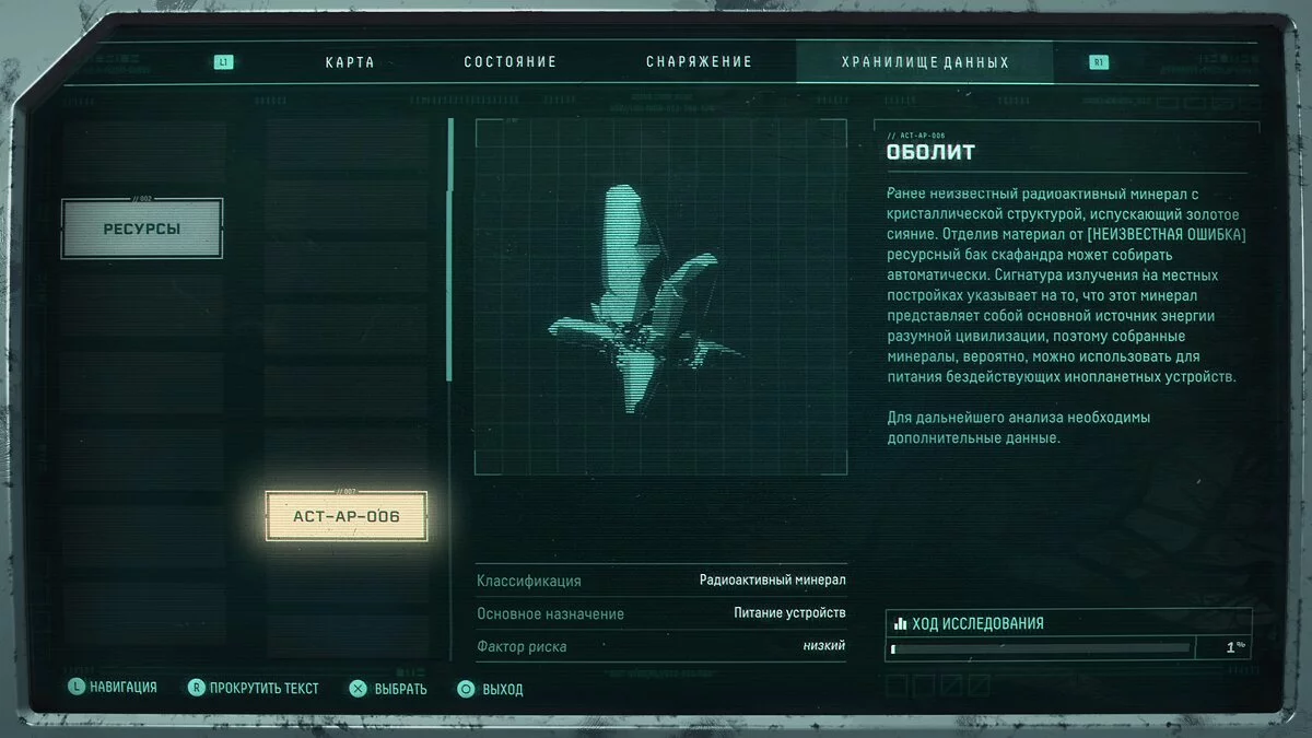 Так как вы все-таки на незнакомой планете, всё, что вы находите — инопланетное. Поэтому каждый предмет Селена, прежде всего, будет сканировать специальным устройством. Компьютер на её руке запомнит свойства того или иного артефакта и автоматически будет подсказывать вам полезную информацию в дальнейшем. Все найденные предметы, записи и врагов можно изучить повторно в хранилище данных. Более того, со временем количество информации по уже изученным объектам возрастает.