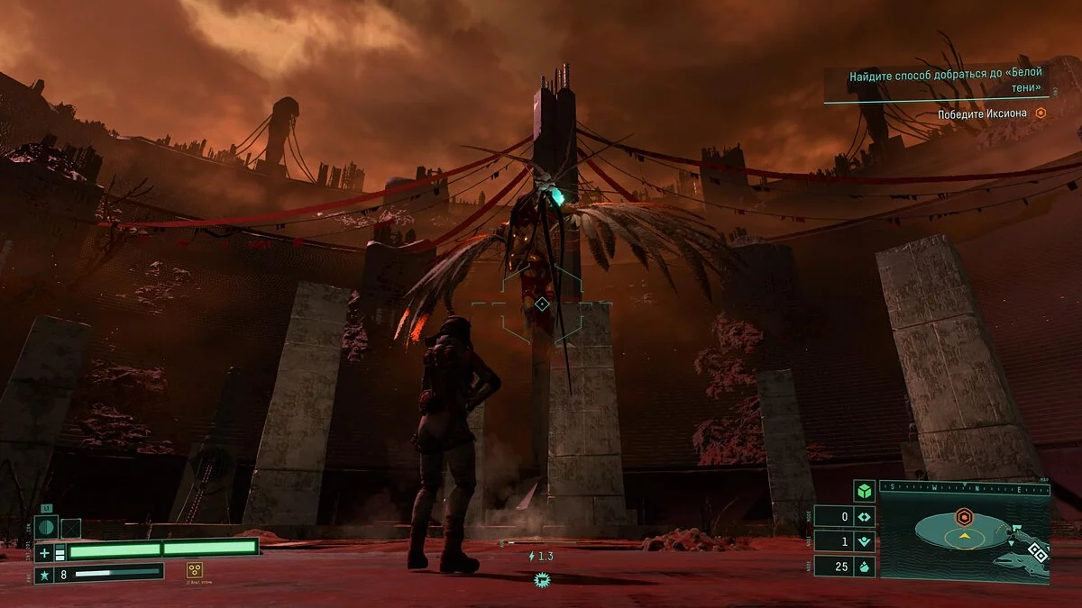 На вершине здания в Багровых пустошах вас будет ждать второй босс — Иксион. Это летающий противник, поэтому атакуя, он будет постоянно перемещаться по карте. Также как и у Фрики, у него три стадии.