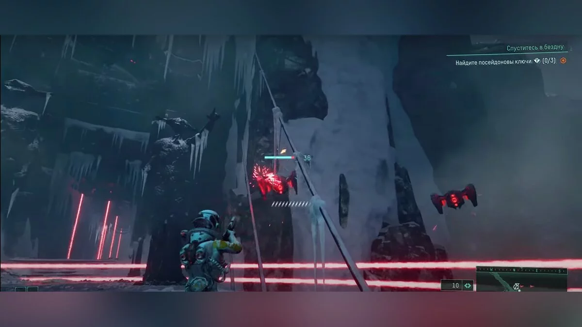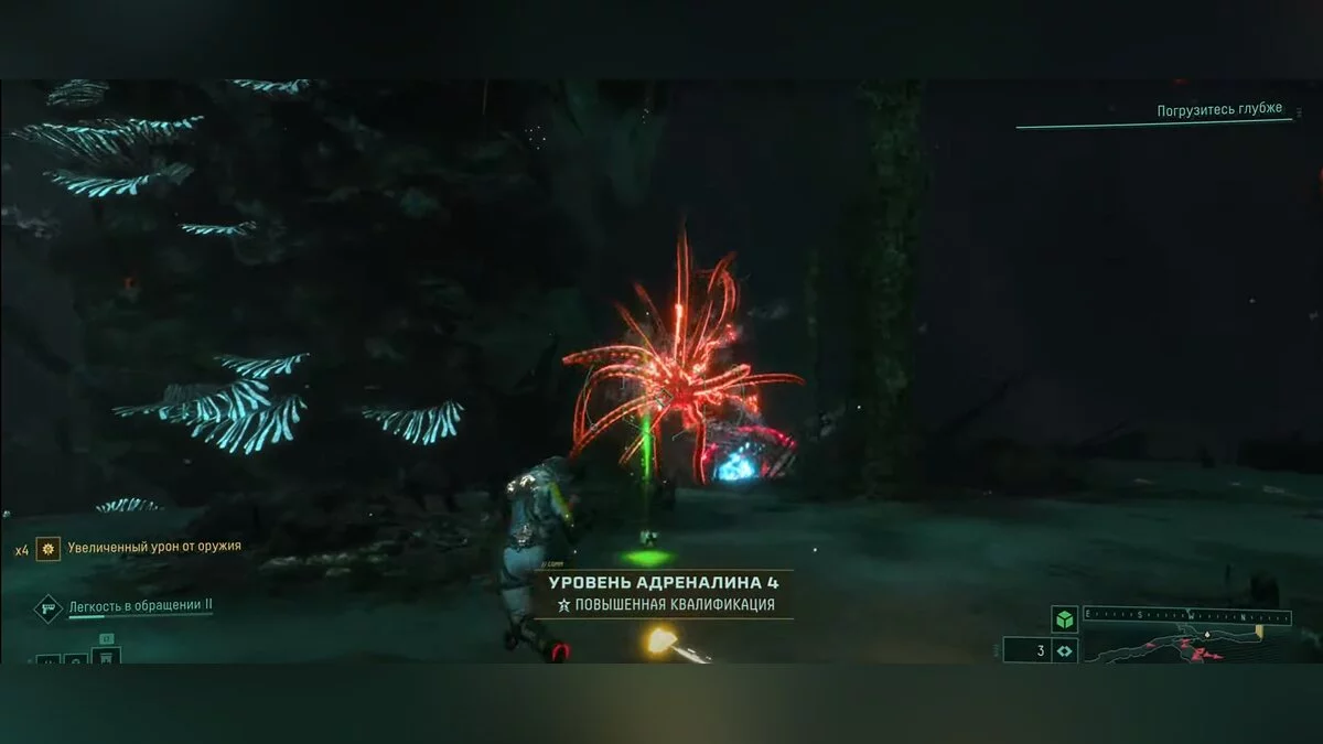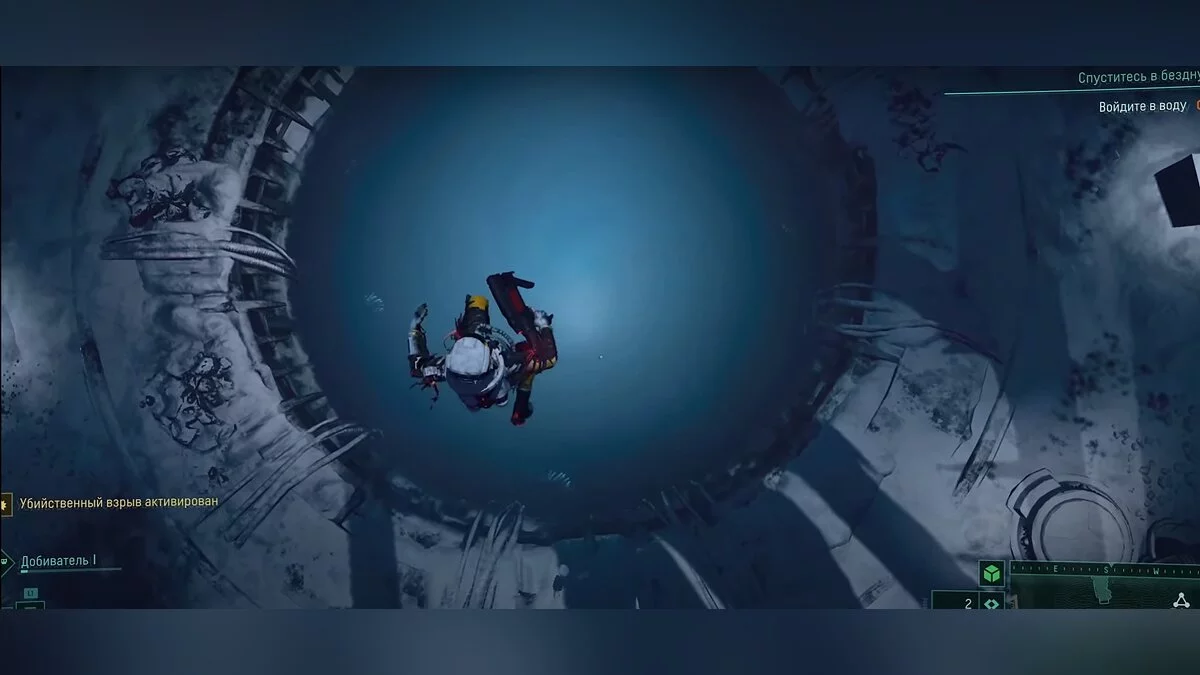 Под водой вы чаще всего будете сражаться с кальмаровидными пришельцами. Маленькие враги нападают большими группами. Несмотря на то, что они наносят совсем немного урона, такие противники опасны своим количеством. Кроме того, вы не можете использовать крюк, чтобы быстро сменить позицию. В этих врагах есть и плюс. Если вам посчастливилось найти вампиризм, вы сможете быстро повысить прочность нанося урон или повышая уровень адреналина. Опасайтесь больших врагов. В бездне они всегда будут наносить вам огромный урон. Кроме того, многие из них испускают энергетические волны, которые проходят сквозь препятствия. Поэтому самой правильной тактикой будет не вовремя использованный рывок, а достаточное расстояние от вас до врагов.