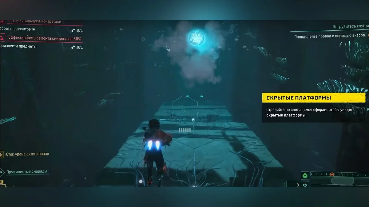 Продолжайте двигаться к маркеру основного задания. Вы найдёте труп когнита с постоянным улучшением для скафандра — Дельфийский визор. Теперь стреляя по светящимся сферам, вы будете видеть скрытые платформы.
