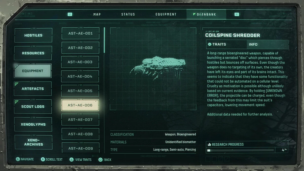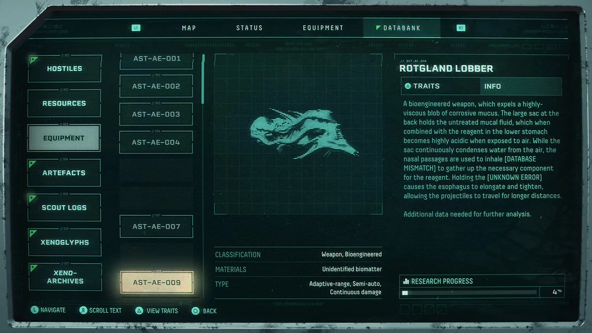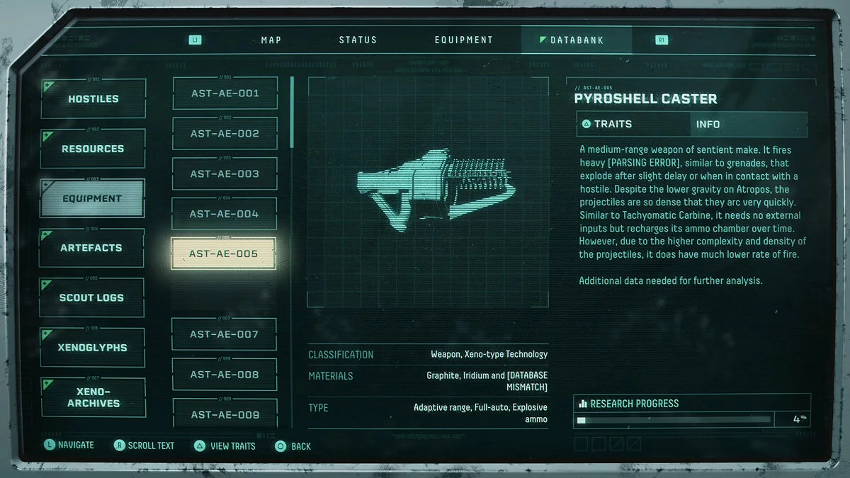 После этого игроку могут попадаться пушки с более высоким уровнем параметров в зависимости от текущей квалификации героини. Черты оружия также могут складываться вместе, образуя разнообразные полезные комбинации. Для всего вооружения в Returnal можно открыть 90 параметров.