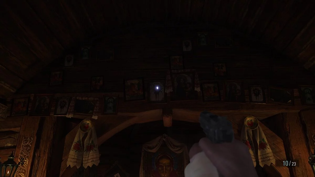 Далее идите в церковь на холме. Если подняться по тропинке слева от церкви, то на дереве можно найти клетку с припасами. Из интересного во дворе церкви можно найти колодец, а на крыше — козий оберег. Внутри церкви есть точка сохранения, сейчас самое время. Заберите с алтаря герб с девой, а также и документ на стуле. Также на одной из икон вверху есть осколок кристалла.
