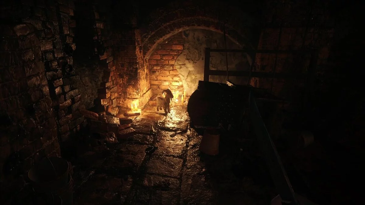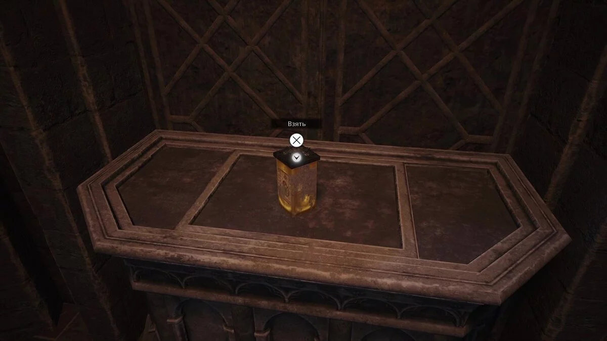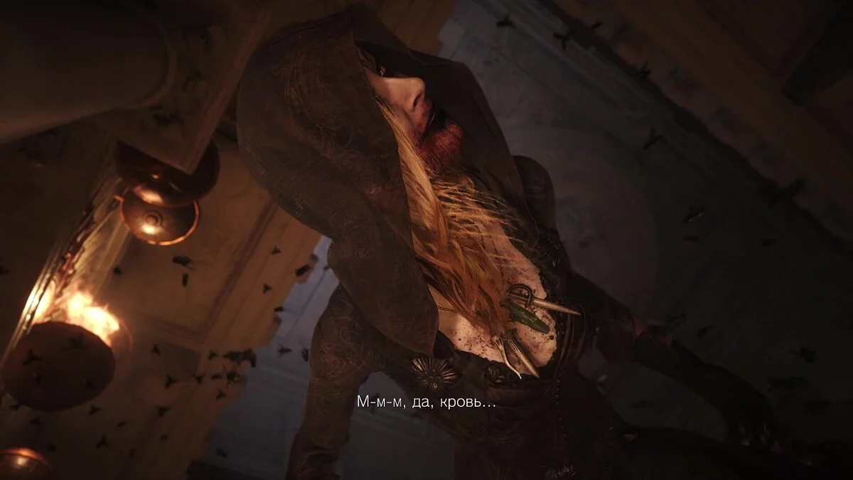 Снова оказавшись в темнице, подберите монеты и порох. Выбирайтесь через пролом в стене. Вы окажетесь в катакомбах, где предстоит побегать от Димитреску. Обыщите помещение, прежде чем дергать рычаг. В крайнем правом конце помещения на столике разбейте ящик и заберите монеты, затем тут же в темном проеме двери подберите реагент с пола. После этого нажмите на рычаг. Запустится катсцена, в которой вампирша отрубает Итану руку. Убежать от нее несложно, но главное не загнать себя в тупик. К слову, Димитреску может разбивать решетки, поэтому бегать от нее будет легче, когда она расчистит помещение. Возвращайтесь к рычагу и заканчивайте начатое. Димитреску преградит дальнейший путь, поэтому обойдите ее с другой стороны. Пробегите по коридору и откройте дверь ключом. Заходите в помещение и заберите маску печали со статуи. Платформа поднимется и вы снова окажетесь во внутреннем дворе. Сейчас можно вернуться в ванную комнату госпожи за помадой.