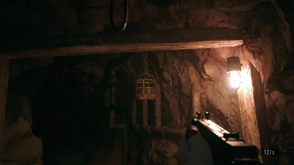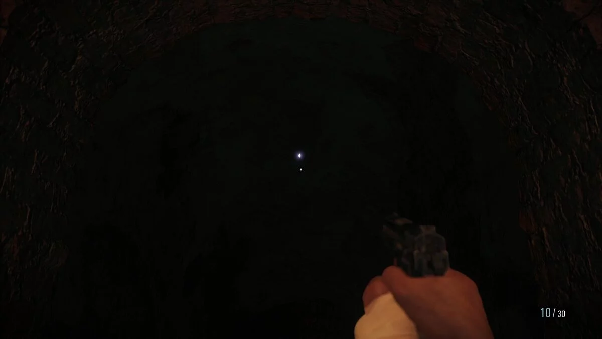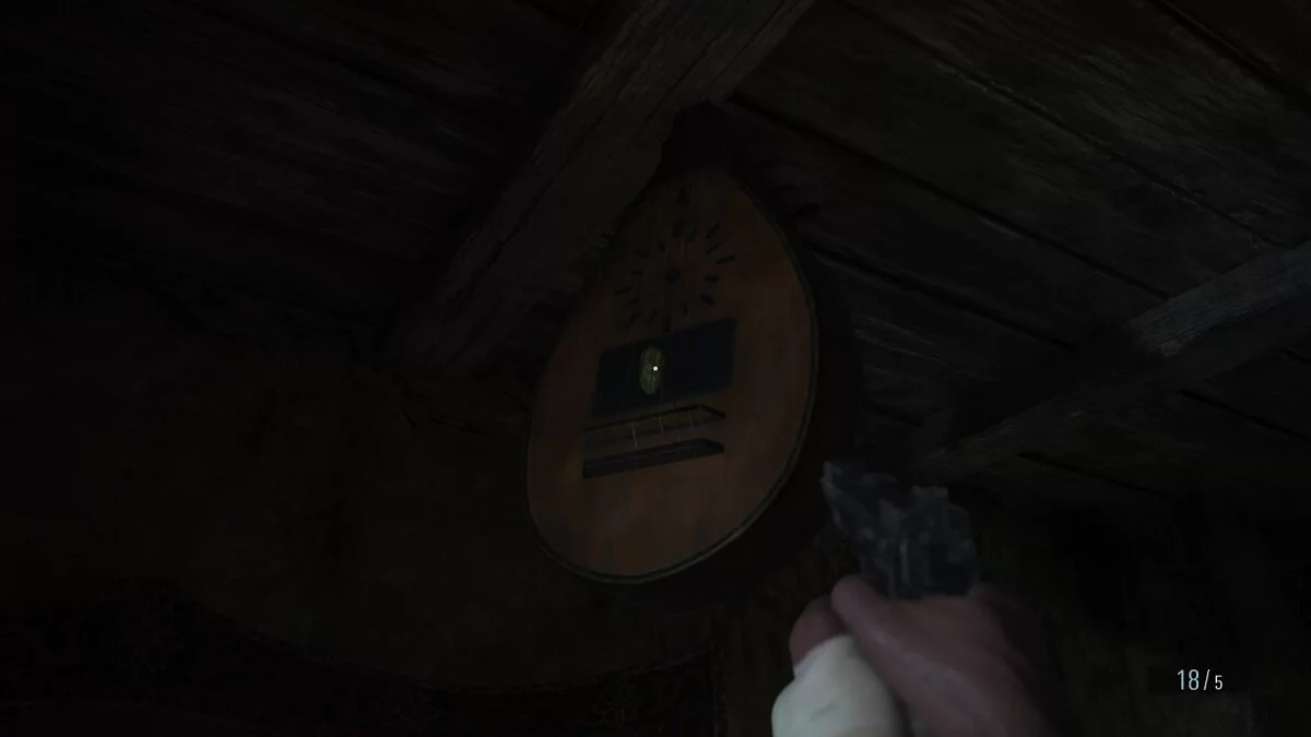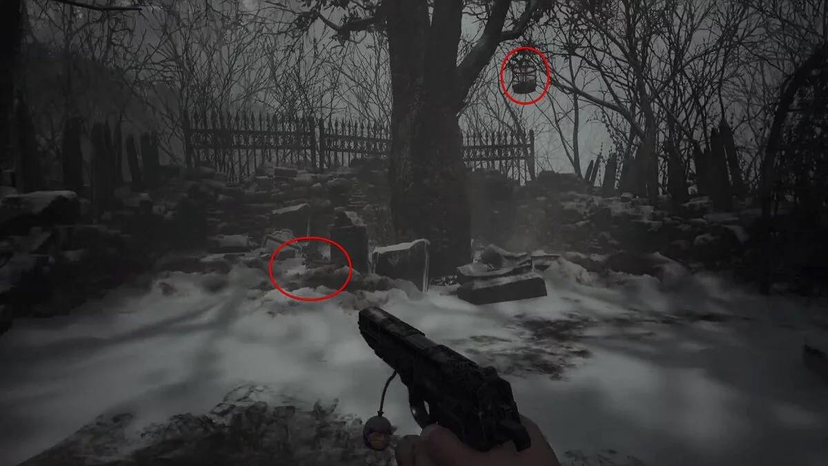 Также в этом подвале есть патроны в центральной комнате с третьим светильником, в левой комнате — монеты (500 x2, 1200, 300 и 2500), в правой комнате — патроны (X2). В комнате со статуей еще лежат патроны револьвера. Теперь выходите и идите к разводному мосту. При помощи рукоятки опустите его и пройдите в новую локацию. Вы здесь уже были ранее, после того, как выбрались из замка Димитреску. Идите через окно на задний двор и примените колесо от колодца. Спускайтесь по лестнице на дно колодца. Здесь предстоит решить загадку.
